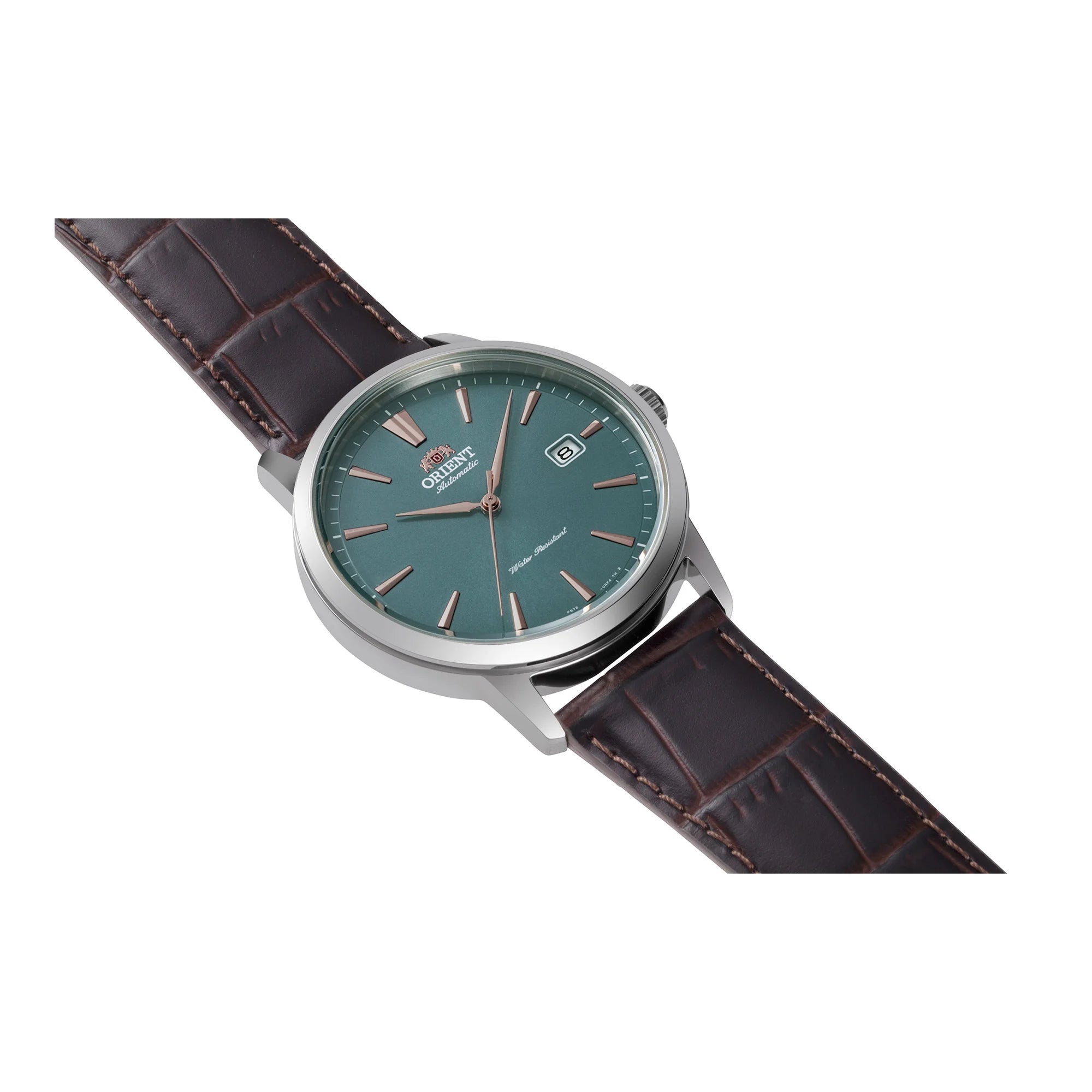 Découvrez l'élégance intemporelle de la montre automatique pour homme ORIENT Symphony III (RA-AC0F13E), un chef-d'œuvre de l'horlogerie japonaise. Ce garde-temps exquis présente un cadran vert opale captivant qui contraste magnifiquement avec un bracelet en cuir véritable marron chocolat. Le boîtier rond en acier inoxydable argenté-gris de 41 mm, d'une épaisseur de seulement 11 mm, offre un profil sophistiqué pour tout homme adulte.