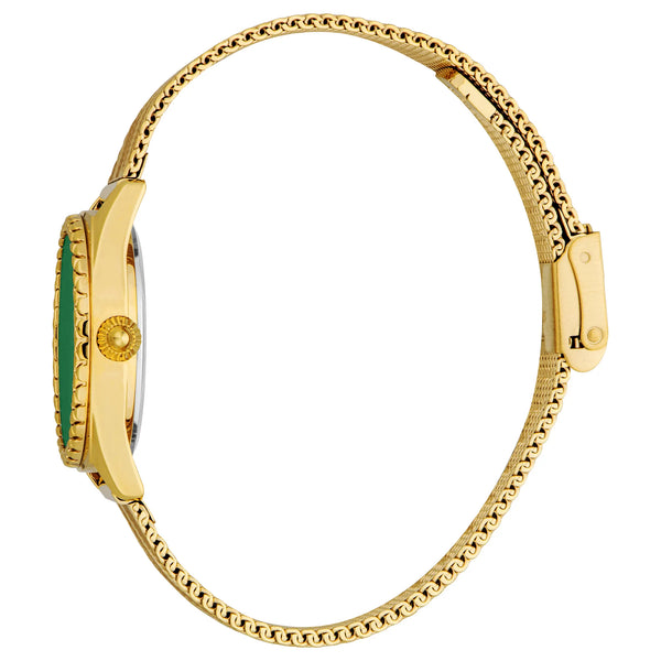 Im Bereich der Mode, wo Eleganz auf Kühnheit trifft, entsteht eine Uhr, die das Wesen von Raffinesse und Mut einfängt. Gefertigt im Herzen des Stils, ist diese Just Cavalli Uhr aus der illustren Animalier Kollektion ein Zeugnis für die außergewöhnliche Kreativität der Marke. Das runde Gehäuse, getaucht in einen luxuriösen Gelbgoldton, strahlt einen Hauch von Opulenz aus und ergänzt perfekt das raffinierte Design, das dieses exquisite Accessoire definiert. Mit einem Gehäusedurchmesser von 30 mm sitzt sie anmutig am Handgelenk, eine subtile, aber auffällige Aussage für modebewusstes Denken. Das flaschengrüne Zifferblatt, das an tiefe, üppige Wälder erinnert, verleiht einen Hauch von Geheimnis und Reiz und zieht mit seiner fesselnden Tiefe die Blicke auf sich. Eingefasst in Mineralglas ist das Zifferblatt geschützt und gewährleistet Klarheit und Haltbarkeit. Das Edelstahlarmband, ebenfalls in Gelbgold, umschließt das Handgelenk mit einem verstellbaren Schiebverschluss und bietet sowohl Komfort als auch Sicherheit. Diese Uhr ist nicht nur ein Zeitmesser, sondern ein Symbol weiblicher Anmut und Stärke, angetrieben von präzisem Quarzwerk und ausgestattet mit einer klassischen 3-Zeiger-Anzeige. Wasserbeständig, steht sie bereit, Sie auf den Abenteuern des Lebens zu begleiten, eine ständige Erinnerung an den mutigen Geist in Ihnen.