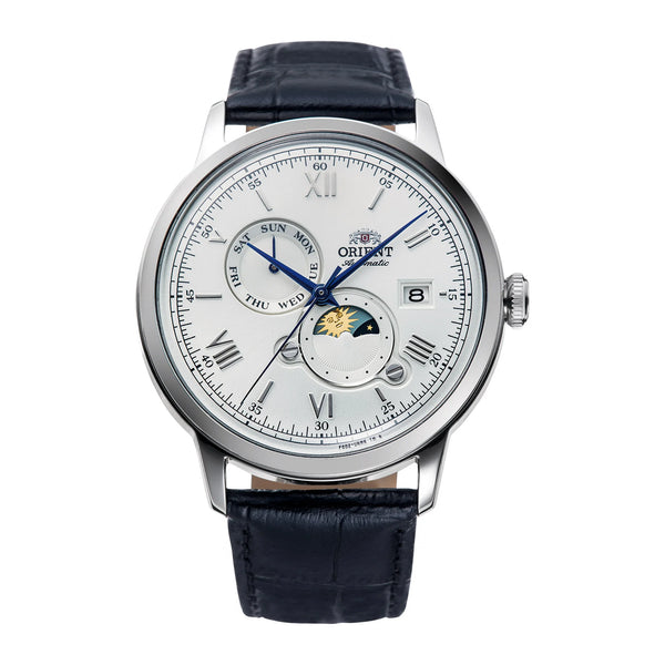Im Bereich der horologischen Eleganz erscheint die ORIENT AK08 Bambino Sun & Moon als ein zeitloses Meisterwerk, ein Zeugnis der Kunst der Uhrmacherei. Gefertigt im Herzen der Präzision, verkörpert diese ORIENT Classic Uhr die Quintessenz von Raffinesse und Stil. Ihr rundes Gehäuse, getaucht in ein glänzendes Silbergrau, misst einen anmutigen Durchmesser von 41 mm und bietet ein verfeinertes Design, das den anspruchsvollen Gentleman anspricht. Das Mineralglas enthüllt ein makelloses weißes Zifferblatt, auf dem der Tanz der Zeit von drei eleganten Zeigern orchestriert wird, angetrieben von der mechanischen Kraft des Kalibers F6B24. Mit 22 Steinen, die einen reibungslosen Betrieb gewährleisten, verspricht diese Uhr eine tägliche Genauigkeit, die von sorgfältiger Handwerkskunst zeugt. Das schwarze Lederarmband, gesichert mit einer Dornschließe, umschließt das Handgelenk mit einem Hauch klassischer Luxus, während der transparente Boden einen Einblick in das komplexe Ballett von Zahnrädern und Federn bietet. Wasserbeständig und ausgestattet mit einer Pull & Push-Krone ist diese Uhr ebenso praktisch wie schön. Der Tages- und Datumsanzeiger fügt eine Funktionsebene hinzu und macht sie zum perfekten Begleiter für den modernen Mann. Ob von Hand aufgezogen oder automatisch, die ORIENT AK08 Bambino Sun & Moon ist eine Feier der Zeit selbst, eine Uhr, die nicht nur die Zeit anzeigt, sondern eine Geschichte von Eleganz und dauerhaftem Stil erzählt.
