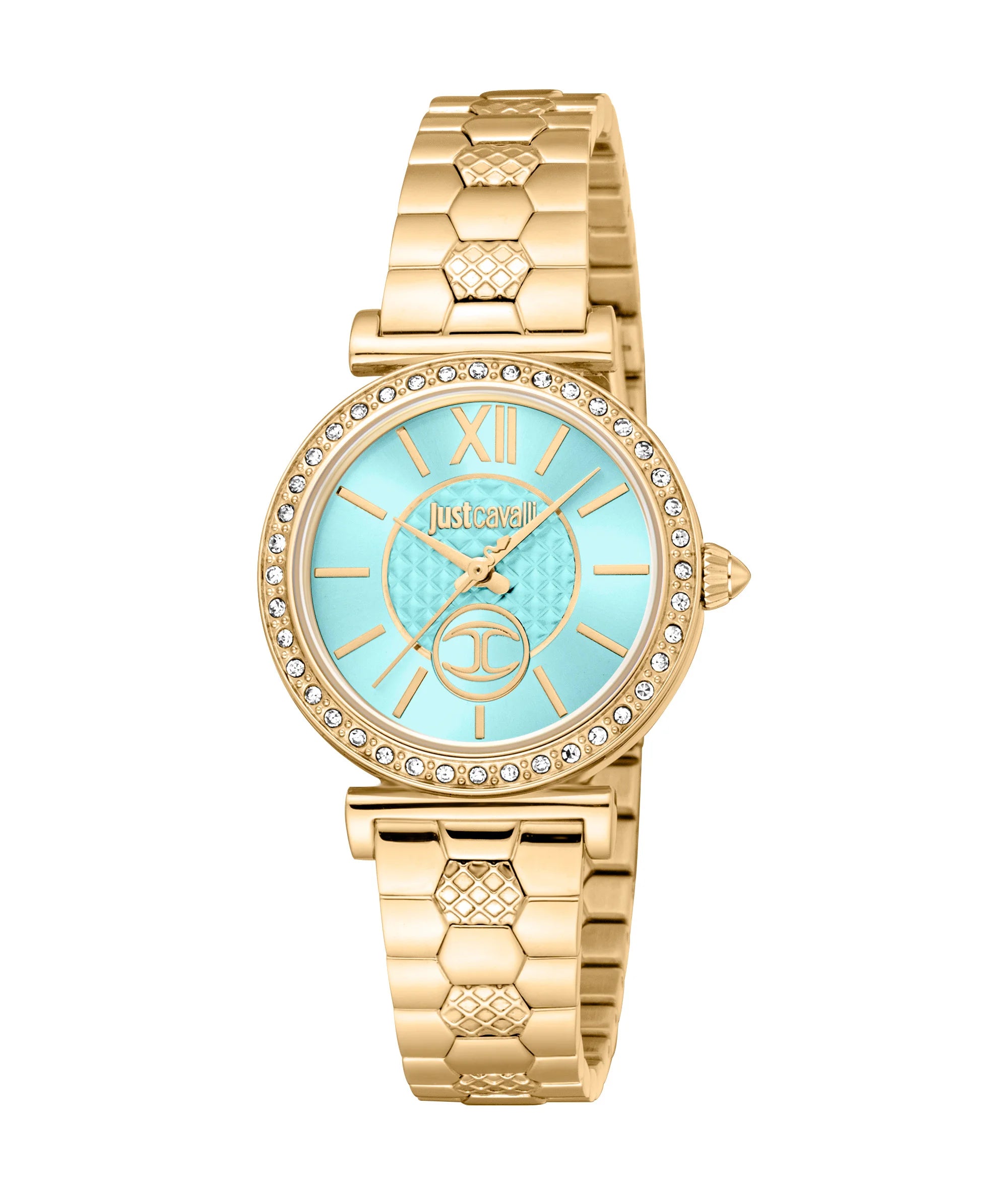 In der Welt der Mode, wo Eleganz auf Kühnheit trifft, entsteht eine Uhr, die das Wesen von Raffinesse und Stil einfängt. Gefertigt im Herzen des italienischen Designs, ist diese Just Cavalli Uhr aus der Varenna Kollektion ein Zeugnis für das Engagement der Marke für Luxus und Innovation. Das runde Gehäuse, getaucht in einen üppigen Gelbgoldton, strahlt ein Gefühl von Opulenz aus, das sowohl zeitlos als auch zeitgenössisch ist. Mit einem Gehäusedurchmesser von 30 mm sitzt sie anmutig am Handgelenk, ein perfekter Begleiter für die moderne Frau, die sowohl Form als auch Funktion schätzt. Das Edelstahlarmband, ebenfalls in passendem Gelbgold, ist eine nahtlose Verlängerung des Gehäuses und bietet ein raffiniertes Design, das sowohl langlebig als auch elegant ist. Die Schmetterlingsfaltschließe mit Druckknopf sorgt für einen sicheren Sitz und ermöglicht es der Trägerin, sich mit Selbstvertrauen und Anmut zu bewegen. Das Zifferblatt, ein lebhaftes Türkis, setzt einen Farbakzent, der für einen verspielten und doch anspruchsvollen Stil steht und es zu einem herausragenden Stück in jedem Ensemble macht. Unter dem Mineralglas hält das Drei-Zeiger-Quarzwerk die Zeit makellos, ein Hinweis auf die Präzision und Zuverlässigkeit, für die Just Cavalli bekannt ist. Mit einer Wasserdichtigkeit von bis zu 50 Metern ist diese Uhr so vielseitig wie schön und bereit, ihre Trägerin vom Konferenzraum bis zum Strand zu begleiten. Die Pull & Push-Krone fügt einen Hauch von Praktikabilität hinzu und ermöglicht einfache Anpassungen, ohne das schlanke Profil der Uhr zu beeinträchtigen. Diese Just Cavalli Uhr ist mehr als nur ein Zeitmesser, sie ist ein Statement von Individualität und Eleganz, ein Spiegelbild des kühnen Geistes derjenigen, die es wagen, sie zu tragen.
