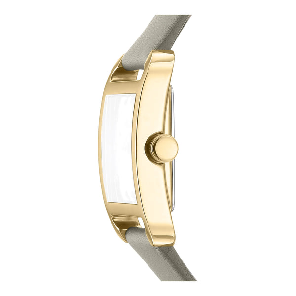 Im pulsierenden Herzen der Stadt, wo Mode auf Funktion trifft, entsteht eine Uhr, die das Wesen urbaner Eleganz verkörpert. Die DKNY DK1L004 City Midi Uhr ist ein Zeugnis moderner Raffinesse, entworfen für die Frau, die die Welt mit Anmut und Selbstvertrauen navigiert. Ihr rechteckiges Gehäuse, getaucht in einen luxuriösen Gelbgoldton, fängt das Licht bei jeder Bewegung ein und schafft eine atemberaubende Stilpräsentation. Mit einem zarten Durchmesser von 27 mm ist diese Uhr der perfekte Begleiter für diejenigen, die Subtilität und Finesse schätzen. Das silbergraue Lederarmband mit seiner feinen Textur schmiegt sich bequem um das Handgelenk und wird von einer klassischen Dornschließe gesichert, die für zeitloses Design steht. Das passende silbergraue Zifferblatt, geschmückt mit drei Zeigern, bietet eine harmonische Verbindung von Form und Funktion, angetrieben von präzisem Quarzwerk. Wasserresistent und geschützt durch ein Mineralglas, ist diese Uhr ebenso praktisch wie schön und bereit, Sie durch die vielfältigen Abenteuer des Stadtlebens zu begleiten. Mit einer Zug- und Druckkrone wird das Einstellen der Zeit zu einer mühelosen Aufgabe, die es Ihnen ermöglicht, sich auf das Wesentliche zu konzentrieren. Die DKNY City Midi Uhr ist nicht nur ein Accessoire, sondern ein Stil-Statement, ein Spiegelbild der lebendigen Energie der Stadt und eine Feier der Reise der modernen Frau.