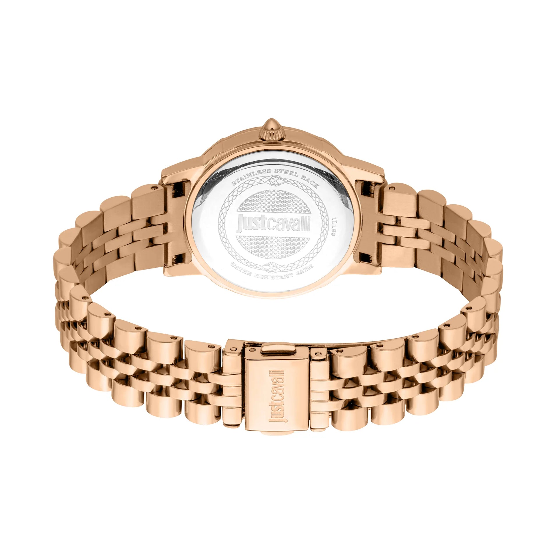 Der Just Cavalli Glam in Roségold ist eine Vision zeitloser Schönheit. Sein rundes Gehäuse und das antikweiße Zifferblatt spiegeln die schicke Philosophie der Marke wider, während das Edelstahlarmband und die Schmetterlingsschließe eine nahtlose Verbindung von Eleganz und Modernität gewährleisten.