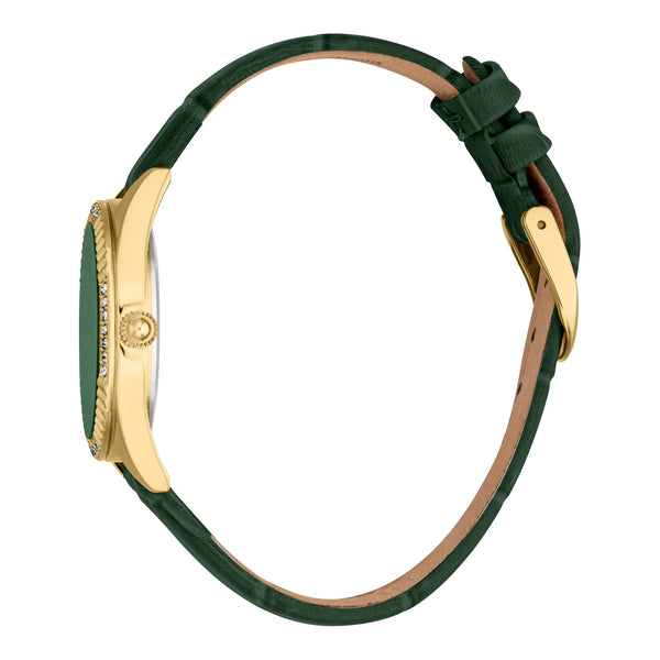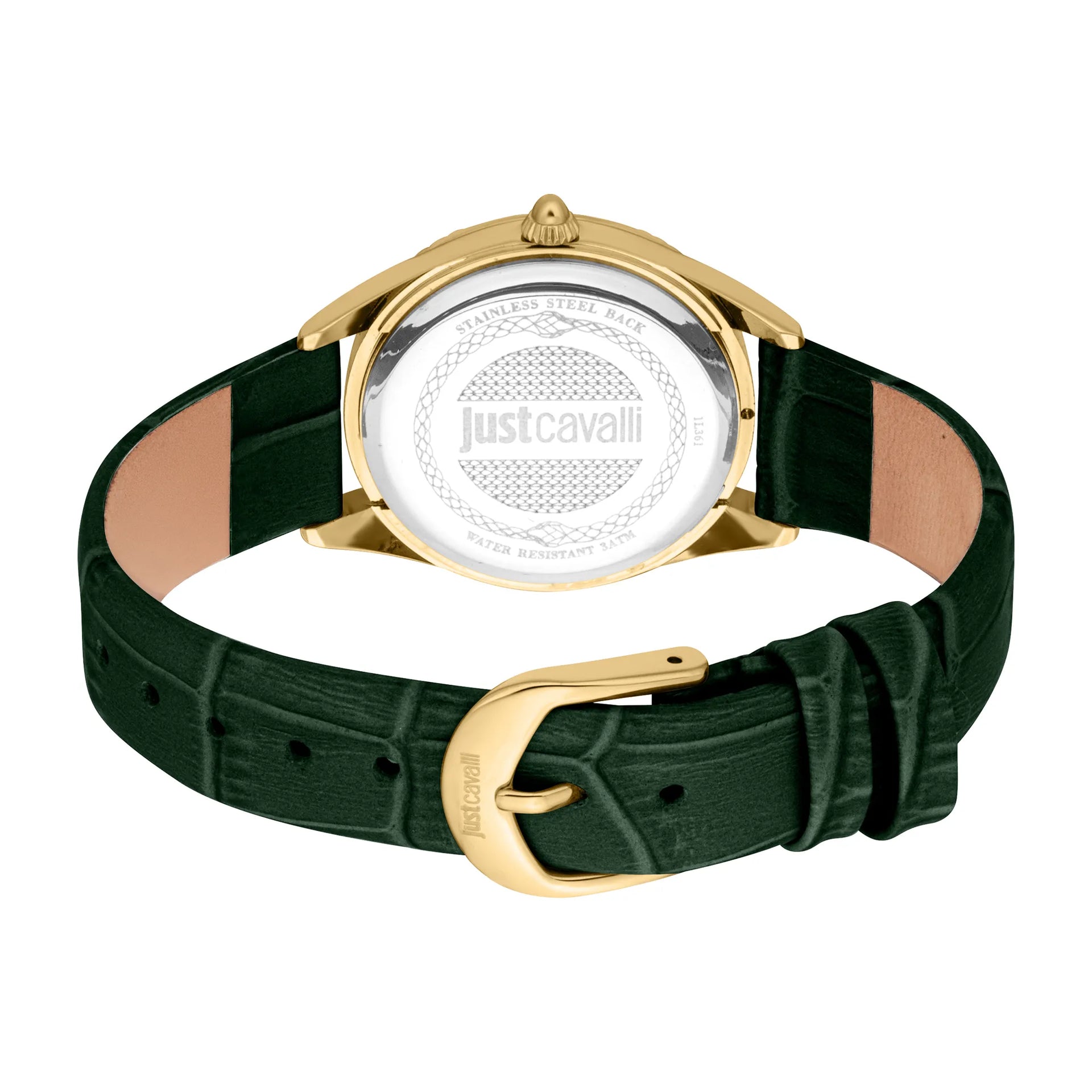Genießen Sie den faszinierenden Charme der Just Cavalli Vittoria Glam. Diese Uhr verfügt über ein rundes Gehäuse aus Gelbgold und ein flaschengrünes Zifferblatt, perfekt ergänzt durch ein passendes Lederarmband. Wasserbeständig und geschützt durch ein Mineralglas verkörpert sie den Stil der Marke für mutige, modische Designs und sorgt dafür, dass Sie überall ein Statement setzen.