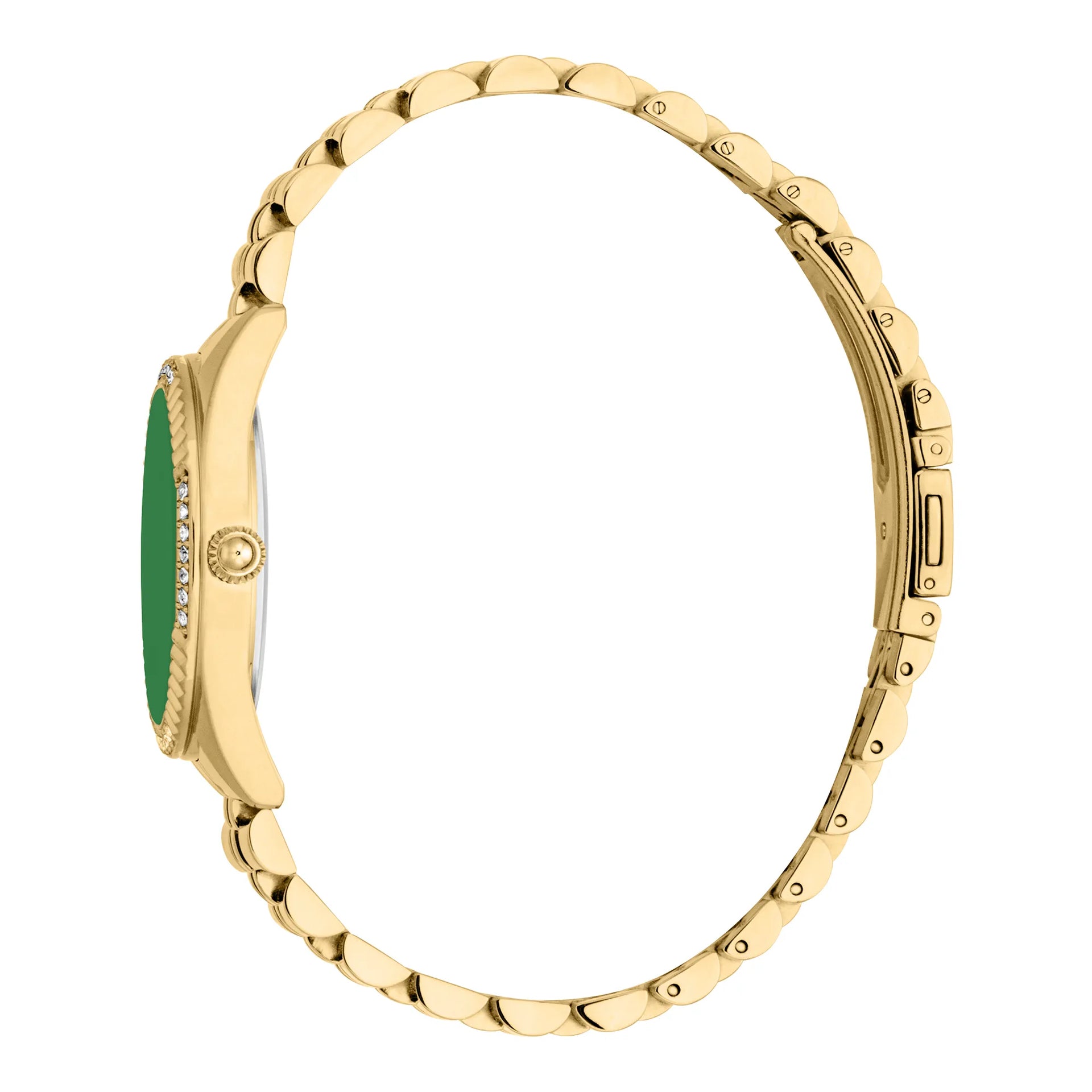 Genießen Sie den Luxus der Just Cavalli Vittoria Glam, ausgestattet mit einem Gehäuse aus Gelbgold und einem auffälligen flaschengrünen Zifferblatt. Diese 32-mm-Uhr mit ihrem Edelstahlarmband verkörpert einen kühnen und dennoch eleganten Stil, perfekt für diejenigen, die es wagen, mit Eleganz aufzufallen.