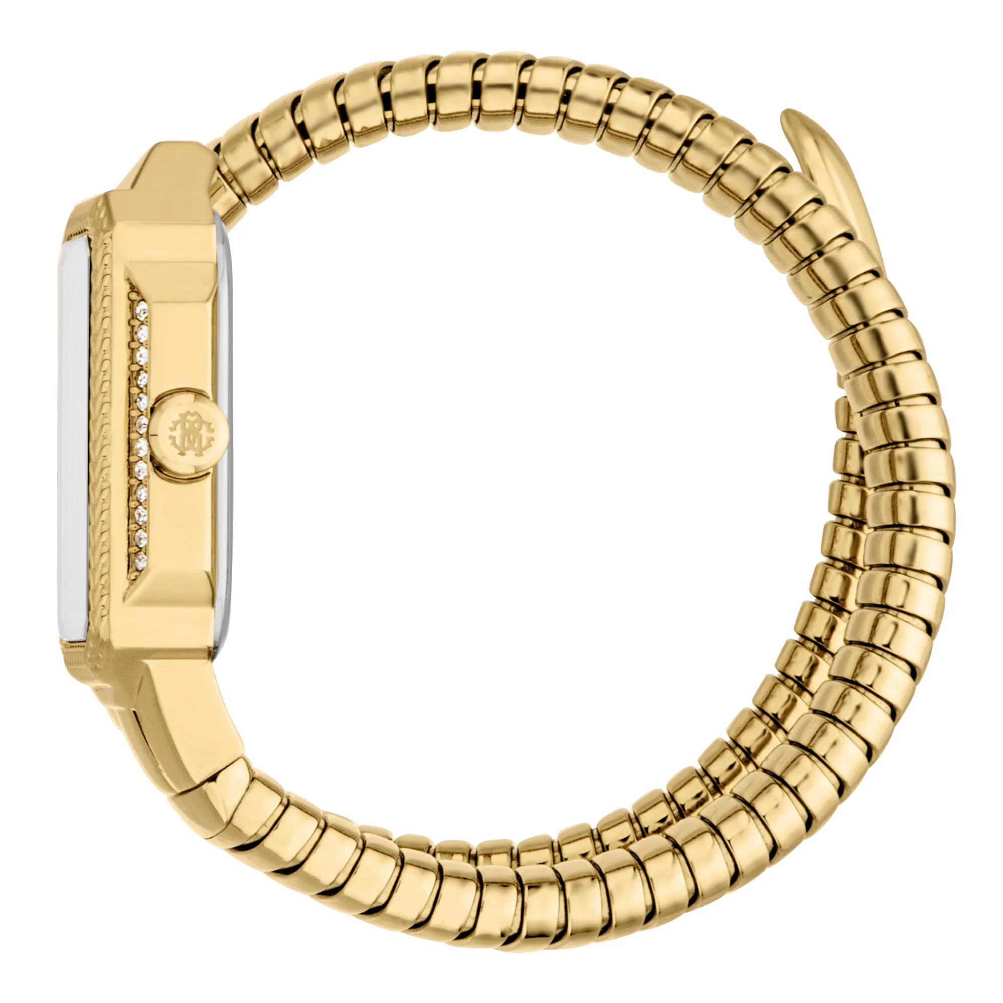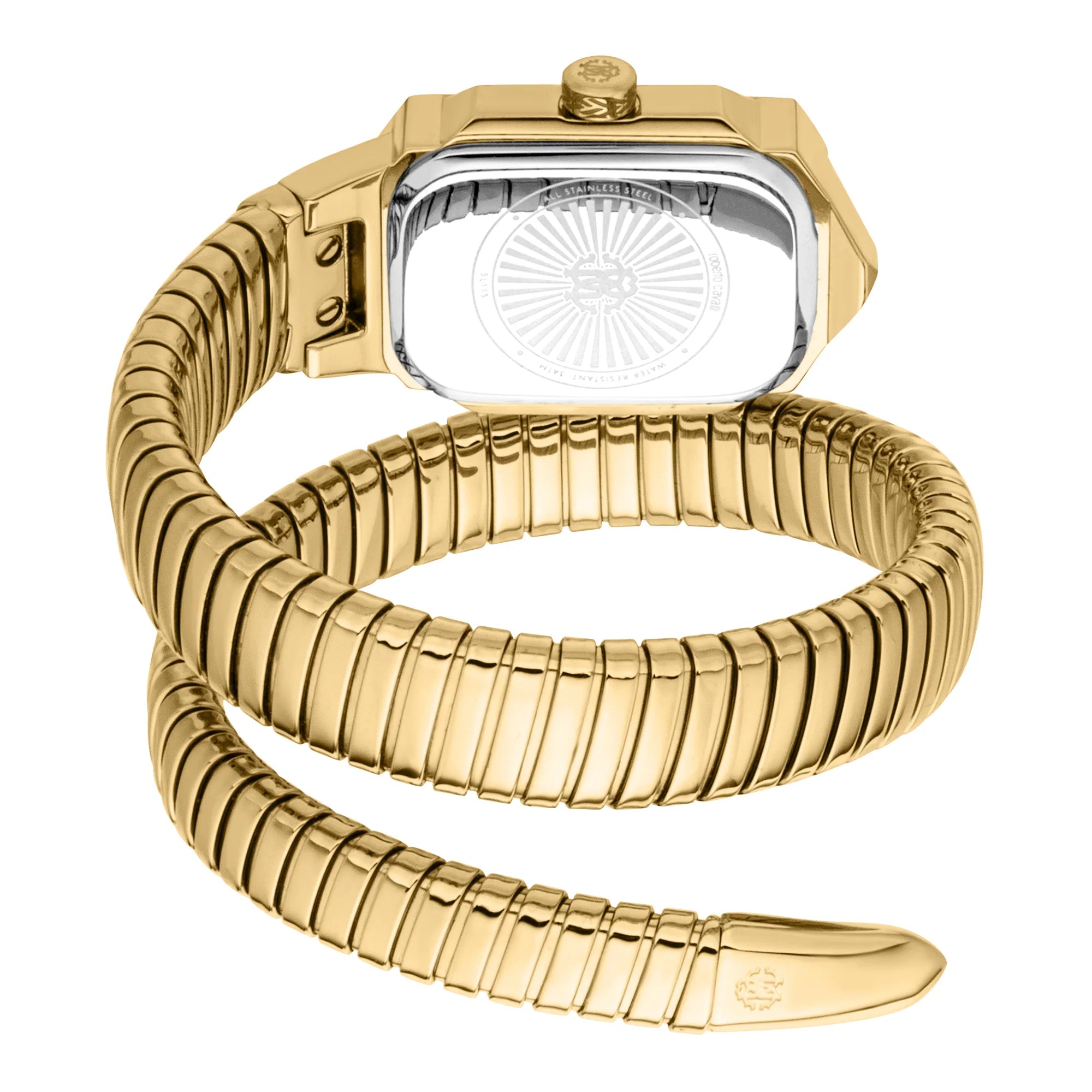 Die Lady-Uhr von Roberto Cavalli in Gelbgold ist ein strahlendes Meisterwerk. Das rechteckige Gehäuse und das Armband strahlen Luxus aus, während das silbergraue Zifferblatt einen Hauch von Eleganz verleiht. Wasserfest und mit einem Mineralglas versehen, verkörpert sie die raffinierte Designphilosophie der Marke.
