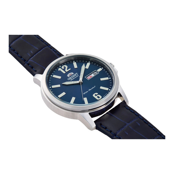 Im Bereich der Zeitmesser, wo Eleganz auf Funktionalität trifft, steht die ORIENT AA0C Conmuter als ein Zeugnis für raffiniertes Design und Präzision. Gefertigt im Herzen horologischer Expertise, ist diese Uhr eine harmonische Verbindung von Stil und Substanz, perfekt für den modernen Mann, der sowohl Ästhetik als auch Leistung schätzt. Ihr rundes Gehäuse, getaucht in ein anspruchsvolles Silbergrau, misst selbstbewusste 41 mm im Durchmesser und setzt ein dezentes, aber wirkungsvolles Statement am Handgelenk. Das Mineralglas schützt ein faszinierendes blaues Zifferblatt, eine Anspielung auf zeitgenössischen Stil mit einem Hauch von lebendiger Farbigkeit, die ins Auge fällt. Das Edelstahlarmband, ebenfalls in Silbergrau, ergänzt das Gehäuse und bietet einen nahtlosen und schlanken Look, gesichert mit einer Dornschließe für Komfort und Bequemlichkeit. Unter seinem eleganten Äußeren liegt das mechanische Herz der Uhr, angetrieben vom Kaliber F6922 mit 22 Steinen, das eine tägliche Genauigkeit von +25/-15 gewährleistet. Diese Uhr dient nicht nur der Zeitmessung, sondern dem Erleben der Zeit, mit Funktionen wie einem Tages- und Datumsanzeiger und einem transparenten Gehäuseboden, der den komplexen Tanz ihres automatischen und handaufgezogenen Uhrwerks offenbart. Mit einer Wasserdichtigkeit von bis zu 50 Metern ist sie ebenso vielseitig wie stilvoll und bereit, Sie von legeren Ausflügen bis zu formelleren Anlässen zu begleiten. Die ORIENT AA0C Conmuter ist mehr als eine Uhr, sie ist ein Begleiter für den anspruchsvollen Gentleman, der die Kunst der Zeitmessung zu schätzen weiß.