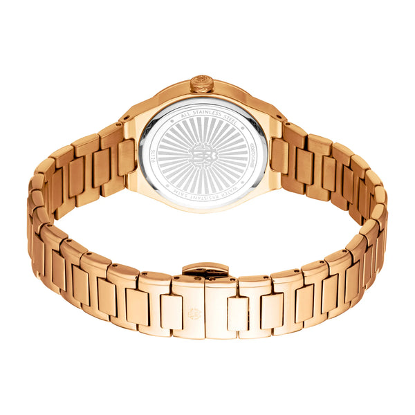 Genießen Sie den romantischen Charme der Roberto Cavalli Lady Uhr, verziert mit einem roségoldenen runden Gehäuse und einem silbergrauen Zifferblatt. Das Edelstahlarmband in Roségold verleiht einen Hauch von Wärme. Wasserdicht bis 50 Meter, verkörpert sie zeitlose Eleganz.