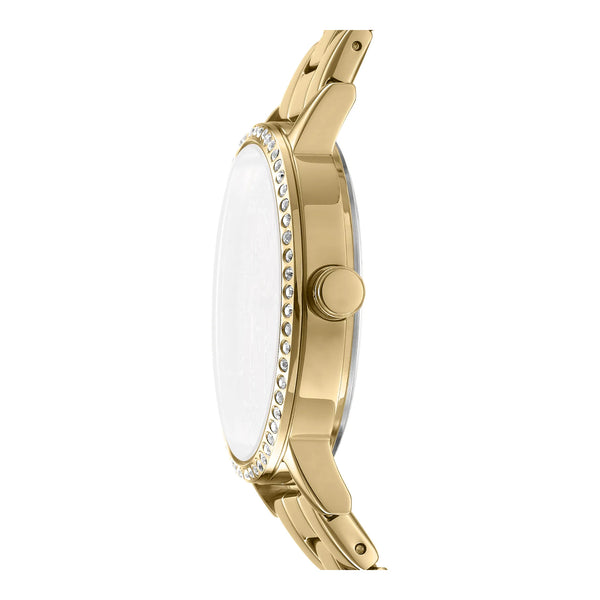 Im pulsierenden Herzen von New York City, wo Mode auf Funktion trifft, entsteht eine Uhr, die den Geist moderner Eleganz verkörpert – die DKNY DK1L035 Soho Logo Uhr. In einem raffinierten Design gefertigt, ist dieses exquisite Accessoire ein Zeugnis für das Engagement der Marke für Stil und Raffinesse. Das runde Gehäuse, getaucht in einen luxuriösen Gelbgoldton, fängt das Wesen urbanen Glamours ein, während sein Durchmesser von 36 mm eine perfekte Passform für die zeitgenössische Frau gewährleistet. Mit einer Wasserdichtigkeit von bis zu 50 Metern ist diese Uhr so vielseitig wie schick und bereit, Sie vom Konferenzraum bis zu einem Abend in der Stadt zu begleiten. Das Mineralglas schützt ein silbergraues Zifferblatt, auf dem drei Zeiger anmutig tanzen, angetrieben von einem präzisen Quarzwerk. Die Pull-&-Push-Krone fügt einen Hauch von Praktikabilität hinzu und ermöglicht einfache Zeiteinstellungen. Das Handgelenk umschließt ein Edelstahlarmband, ebenfalls in Gelbgold, das sicher mit einer Butterfly-Faltschließe mit Druckknopfmechanismus schließt. Diese nahtlose Verbindung von Form und Funktion macht die DKNY Soho Logo Uhr zu einem unverzichtbaren Accessoire für diejenigen, die die schönen Dinge im Leben schätzen, und bietet einen Einblick in eine Welt, in der Zeit nicht nur gemessen, sondern gefeiert wird.