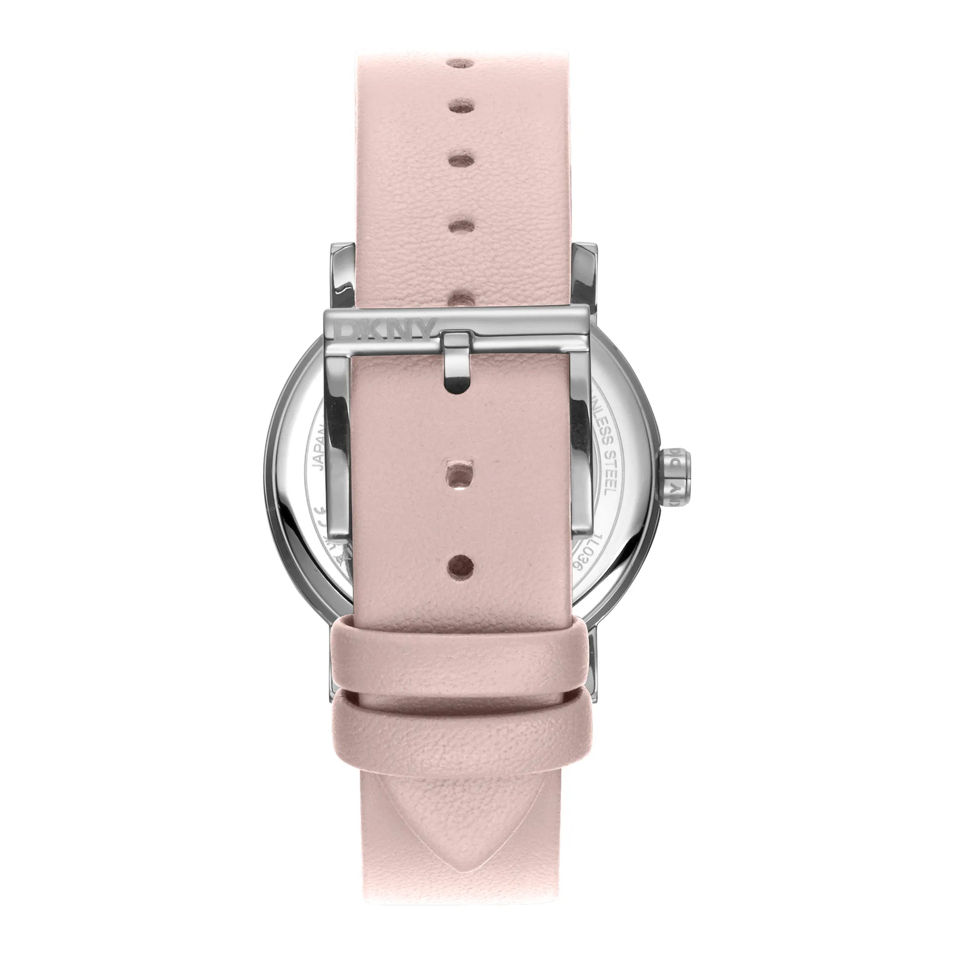 Die DKNY Soho Midi in silbergrau ist eine zarte Mischung aus Eleganz und Charme. Mit einem 34 mm runden Gehäuse und einem pinkfarbenen Lederarmband bietet diese Uhr eine feminine Note. Ihre Wasserdichtigkeit bis zu 50 Metern und die Dornschließe gewährleisten sowohl Stil als auch Praktikabilität, was sie zu einem idealen Accessoire für die moderne Frau macht, die sowohl Schönheit als auch Funktionalität schätzt.