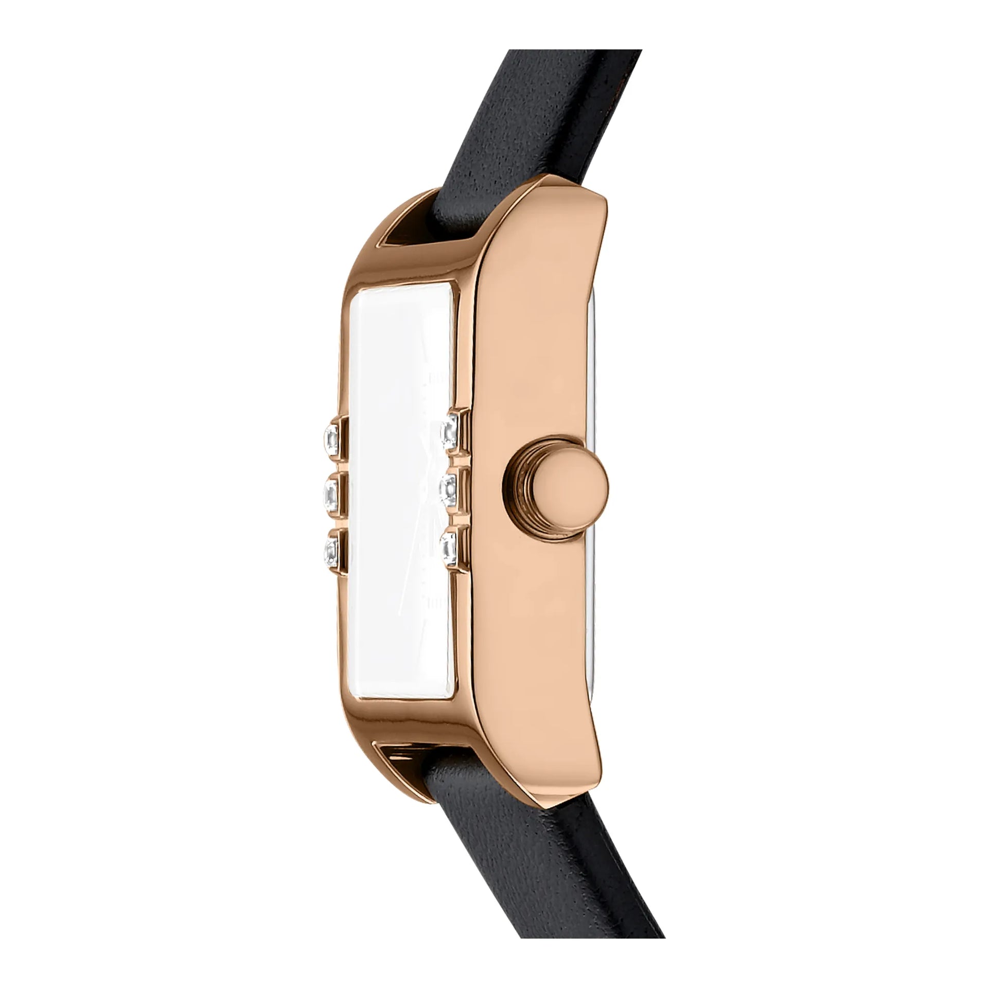 Die DKNY Westside Glitz in Roségold ist eine Feier zeitgenössischer Eleganz. Ihr elegantes schwarzes Zifferblatt und das Lederarmband schaffen einen auffälligen Kontrast, während die Dornschließe einen perfekten Sitz gewährleistet. Diese Uhr ist ein mutiges Statement-Stück für die moderne Frau.