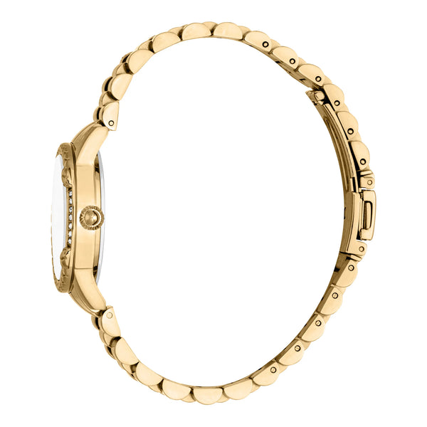 Im Bereich der Mode, wo Eleganz auf Kühnheit trifft, entsteht eine Uhr, die den Geist der modernen Frau verkörpert: die Just Cavalli Watch aus der illustren Animalier Kollektion. Gefertigt im Herzen der Schweizer Präzision, ist diese Uhr ein Zeugnis für das Kühne und das Schöne. Ihr rundes Gehäuse, getaucht in den Glanz von Gelbgold, fängt die Essenz von Luxus ein, während das antikweiße Zifferblatt Geschichten zeitloser Raffinesse erzählt. Der Durchmesser von 30 mm ist eine perfekte Balance aus Anmut und Präsenz und macht sie zu einem idealen Begleiter für jeden Anlass. Mit einer Wasserdichtigkeit von bis zu 50 Metern verspricht sie Widerstandsfähigkeit gegen die Elemente und stellt sicher, dass Stil niemals kompromittiert wird. Das Mineralglas schützt das Zifferblatt und bietet Klarheit und Schutz, während die Pull & Push Krone einen Hauch von Praktikabilität hinzufügt. Das Edelstahlarmband, ebenfalls in Gelbgold, umschließt das Handgelenk mit einem Gefühl von raffinierter Eleganz, gesichert durch eine Faltschließe mit Druckknopf für Leichtigkeit und Komfort. Angetrieben von einem präzisen Quarzwerk tanzt die Drei-Zeiger-Anzeige anmutig über das Zifferblatt und markiert jeden Moment mit Präzision. Diese Just Cavalli Watch ist nicht nur ein Accessoire, sondern ein Statement von Charakter und Kühnheit, eine Feier des furchtlosen Geistes, der es wagt, in einer Welt der Konformität herauszustechen.
