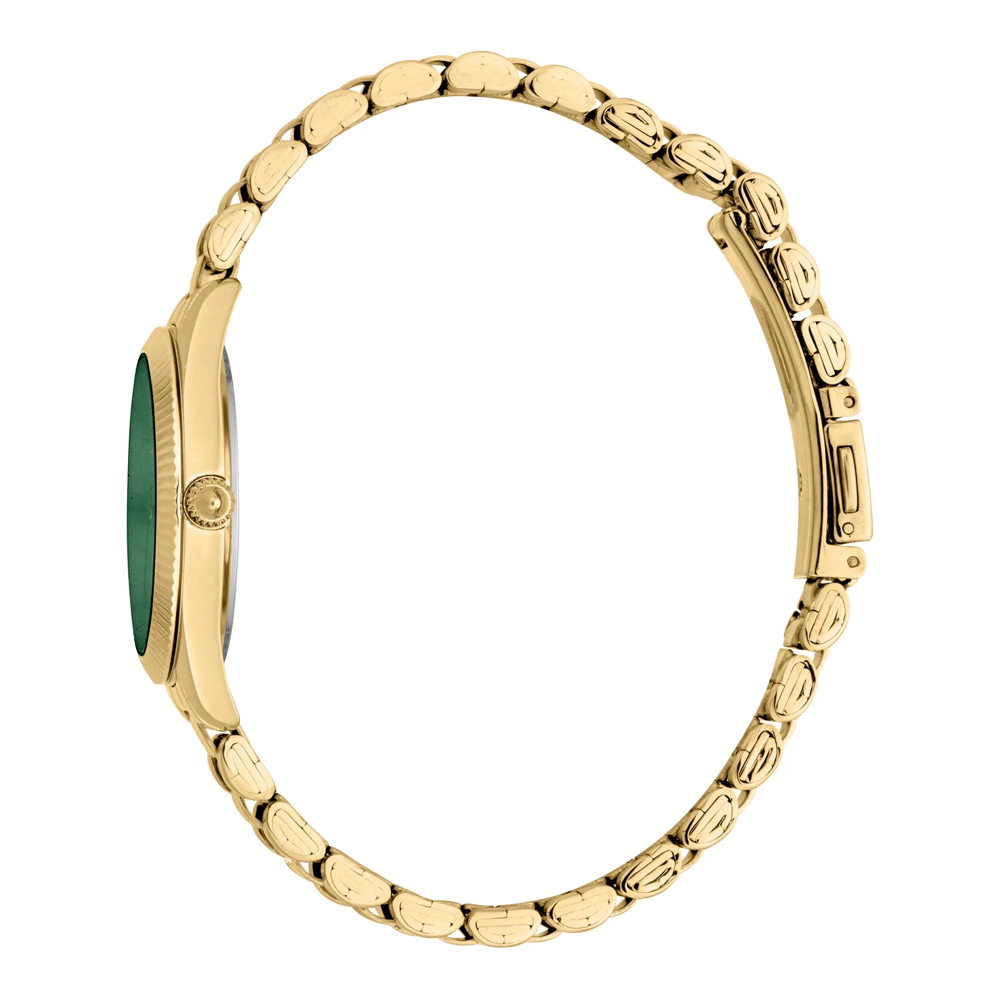 In der Welt der Mode, wo Eleganz auf Kühnheit trifft, entsteht eine Uhr, die das Wesen von Raffinesse und Stil einfängt. Gefertigt im Herzen der Schweizer Uhrmacherkunst, ist diese Just Cavalli Watch aus der Glam Chic Kollektion ein Zeugnis für verfeinertes Design und exquisite Handwerkskunst. Ihr rundes Gehäuse, getaucht in den warmen Glanz von Gelbgold, strahlt eine zeitlose Anziehungskraft aus, die perfekt die modebewussten Sensibilitäten der modernen Frau ergänzt. Mit einem Gehäusedurchmesser von 30 mm sitzt sie anmutig am Handgelenk, ein dezentes, aber auffälliges Statement von Luxus. Das flaschengrüne Zifferblatt, das an üppige, grüne Landschaften erinnert, verleiht dem kühnen Charakter der Uhr einen Hauch von natürlicher Ruhe. Geschützt durch ein Mineralglas, verfügt das Zifferblatt über eine klassische 3-Zeiger-Anzeige, angetrieben von präzisem Quarzwerk, das sicherstellt, dass die Zeit immer auf Ihrer Seite ist. Das Edelstahlarmband, ebenfalls in Gelbgold, umschließt das Handgelenk mit einem Gefühl von Kontinuität und Eleganz, gesichert durch eine Butterfly-Faltschließe mit Druckknopf für Leichtigkeit und Komfort. Bis zu 50 Meter wasserdicht, ist diese Uhr so vielseitig wie schön und bereit, Sie von den belebten Straßen der Stadt bis zu ruhigen Küstenausflügen zu begleiten. Eine wahre Verkörperung von Mode und Funktion, ist diese Just Cavalli Watch nicht nur ein Accessoire, sondern ein Statement von Individualität und Anmut, entworfen für die Frau, die es wagt, in einer Welt der Konformität herauszustechen.