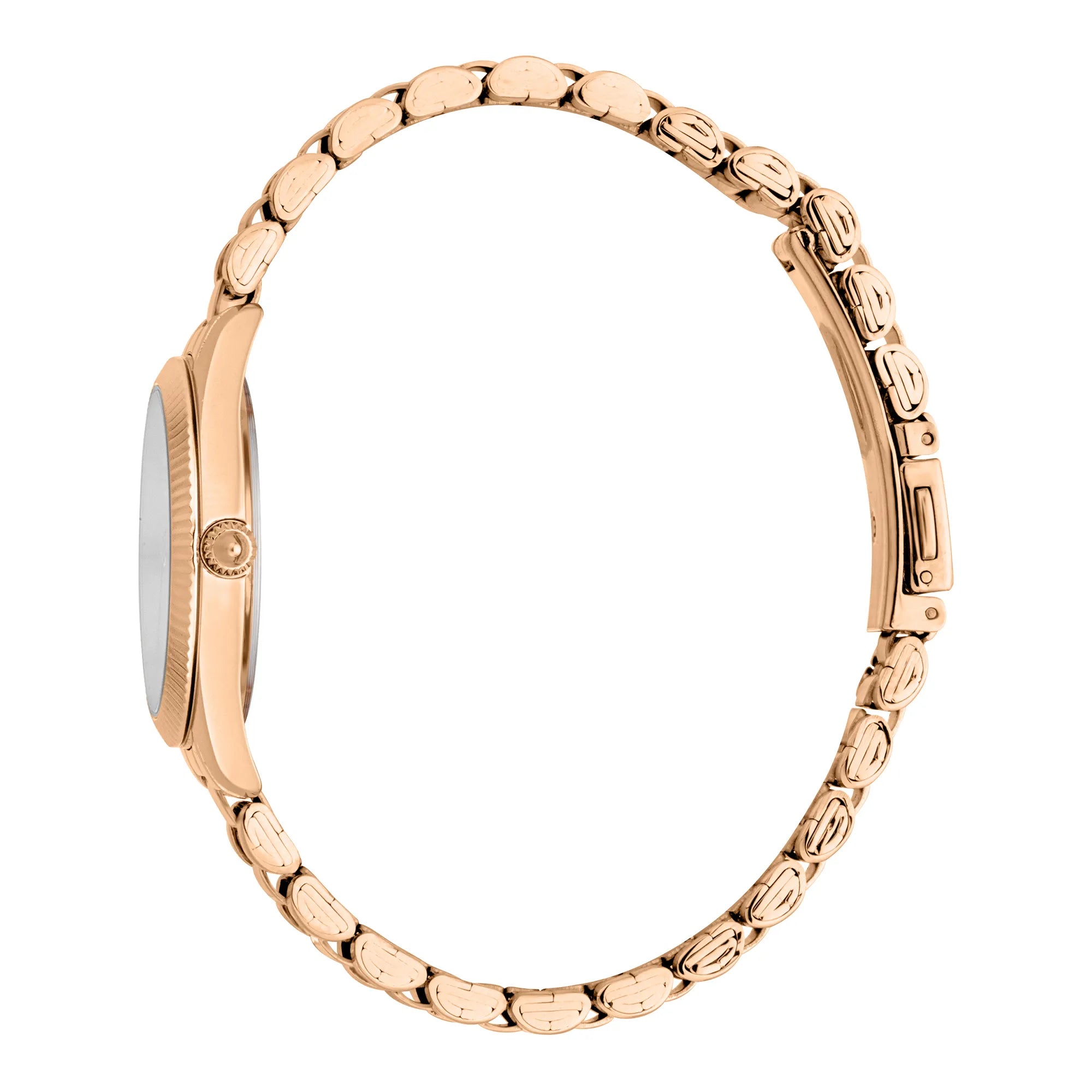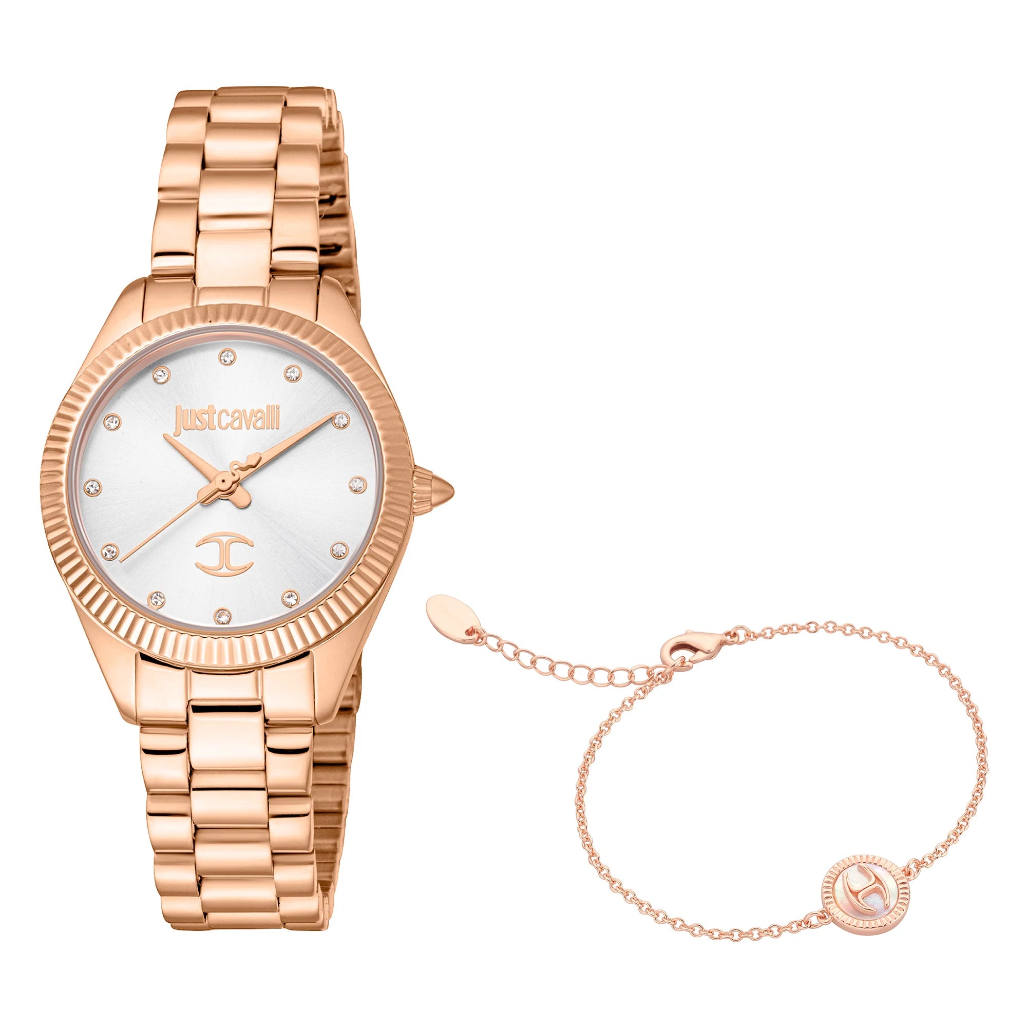 Im Bereich von Eleganz und Raffinesse erscheint die Just Cavalli Uhr aus der Glam Chic Kollektion als ein Leuchtturm von Stil und Anmut. Im Herzen der Mode gefertigt, ist diese exquisite Uhr ein Zeugnis für das Engagement der Marke für Luxus und Design. Das runde Gehäuse, getaucht in einen warmen Roségoldton, fängt die Essenz moderner Weiblichkeit ein, während sein Durchmesser von 30 mm eine zarte, aber auffällige Präsenz am Handgelenk gewährleistet. Mit einer Wasserdichtigkeit von bis zu 50 Metern verspricht sie sowohl Schönheit als auch Funktionalität und ist somit ein perfekter Begleiter für jeden Anlass. Das Mineralglas schützt das silbergraue Zifferblatt, auf dem drei Zeiger anmutig tanzen, angetrieben von einem präzisen Quarzuhrwerk. Das Edelstahlarmband, ebenfalls in Roségold, schmiegt sich mit einer Schmetterlingsfaltschließe um das Handgelenk und bietet sowohl Sicherheit als auch Tragekomfort. Diese Just Cavalli Uhr ist nicht nur ein Accessoire, sondern ein Statement für zukunftsorientiertes Denken in der Mode, ein Stück, das den Geist zeitgenössischer Eleganz und den Reiz zeitlosen Designs verkörpert.