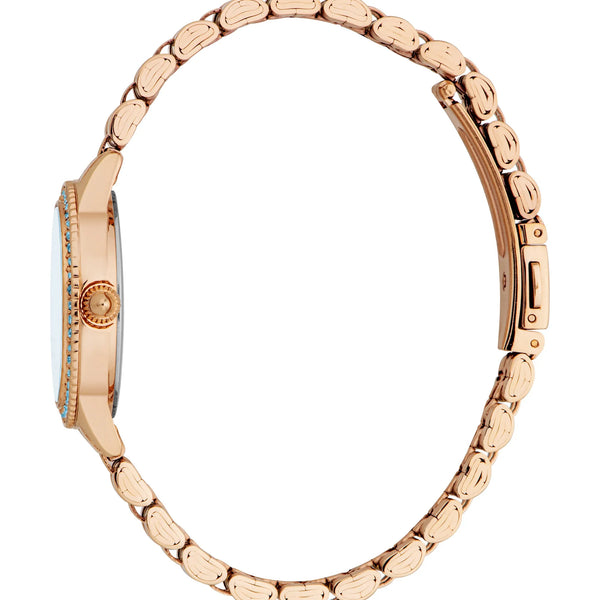 Im Bereich der modischen Zeitmesser steht die Just Cavalli Glam Chic Kollektion als ein Zeugnis von Eleganz und Stil. Präzise gefertigt, ist diese Just Cavalli Uhr ein Meisterwerk des raffinierten Designs, das ein Gefühl von Raffinesse ausstrahlt, das sowohl zeitlos als auch zeitgemäß ist. Das runde Gehäuse, getaucht in einen luxuriösen Roségoldton, fängt die Essenz moderner Weiblichkeit ein, während sein Durchmesser von 30 mm eine zarte, aber auffällige Präsenz am Handgelenk gewährleistet. Das hellblaue Zifferblatt, das an einen klaren Sommerhimmel erinnert, fügt einen Farbtupfer hinzu, der den mutigen und abenteuerlustigen Geist seines Trägers widerspiegelt. Dieser lebendige Akzent wird perfekt durch das roségoldene Edelstahlarmband ergänzt, das sich mit einer Butterfly-Faltschließe um das Handgelenk legt und sowohl Komfort als auch Sicherheit bietet. Das Mineralglas schützt das Zifferblatt, während die Pull & Push-Krone eine einfache Einstellung ermöglicht. Angetrieben von einem präzisen Quarzwerk verspricht diese Uhr Zuverlässigkeit und Genauigkeit und ist somit ein unverzichtbares Accessoire für die modebewusste Frau. Wasserbeständig ist sie darauf ausgelegt, den Anforderungen des Alltags standzuhalten, während die Drei-Zeiger-Anzeige einen klassischen Akzent setzt. Diese Just Cavalli Uhr ist nicht nur ein Zeitmesser, sondern ein Stil-Statement, ein Spiegelbild der einzigartigen Persönlichkeit des Trägers und eine Feier der Kunst der Uhrmacherei.