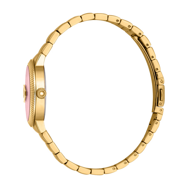 Der Just Cavalli Puntale in Gelbgold ist ein strahlender Ausdruck von Glamour. Sein pinkes Zifferblatt ist in einem runden Gehäuse aus Gelbgold eingefasst, ergänzt durch ein passendes Armband aus Edelstahl. Dieses modische Stück ist perfekt für diejenigen, die es wagen, zu glänzen.