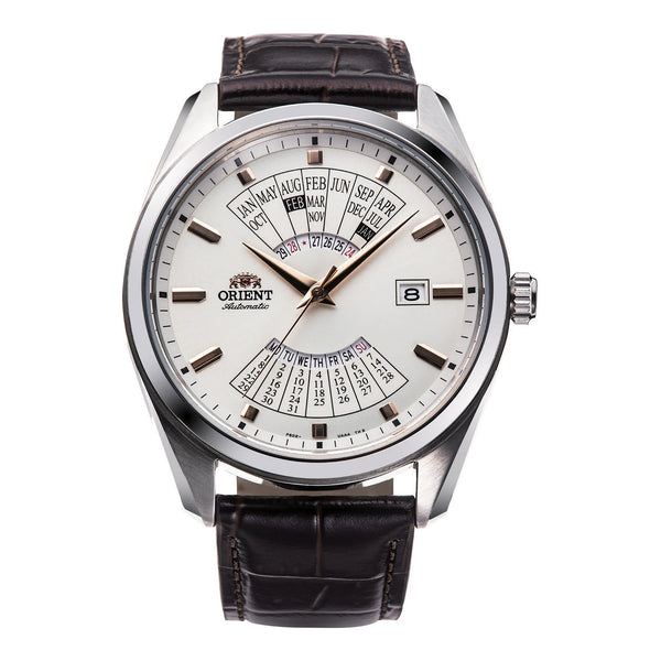 Im Bereich der Zeitmessung, wo Präzision auf Kunstfertigkeit trifft, entsteht ein Meisterwerk, das über bloße Funktionalität hinausgeht. Gefertigt im Herzen der horologischen Innovation, ist die ORIENT BA00 Multi Year Calendar Uhr ein Zeugnis für das Engagement der Marke für Exzellenz. Diese ORIENT Contemporary Armbanduhr mit ihrem runden silbergrauen Gehäuse strahlt ein raffiniertes Design aus, das den Geschmack des modernen Gentlemans anspricht. Der Durchmesser von 43 mm bietet eine kühne und dennoch anspruchsvolle Präsenz am Handgelenk, während das Mineralglas Klarheit und Haltbarkeit gewährleistet. Ein transparenter Boden offenbart den filigranen Tanz des mechanischen Uhrwerks, angetrieben vom Kaliber F6D22 mit 22 Steinen, ein Wunder für diejenigen, die die Kunst der Uhrmacherei schätzen. Das hellgraue Zifferblatt, geschmückt mit einem Multi Year Calendar, Tages-, Datums-, Monats- und Jahresanzeige, ist eine Leinwand der Eleganz und Funktionalität. Die Pull & Push-Krone ermöglicht nahtlose Einstellungen, während die automatischen und handaufgezogenen Funktionen sicherstellen, dass die Zeit immer auf Ihrer Seite ist. Eingehüllt in ein bis zu 50 Meter wasserdichtes Gehäuse, ist diese Uhr so vielseitig wie stilvoll. Das braune Lederarmband, gesichert mit einer Dornschließe, verleiht einen Hauch klassischen Charmes und macht sie zum perfekten Begleiter für jedes legere Ensemble. Diese ORIENT Uhr ist nicht nur ein Zeitmesser, sondern ein Statement zeitloser Eleganz und anspruchsvollen Stils, entworfen für diejenigen, die die schönen Dinge im Leben zu schätzen wissen.