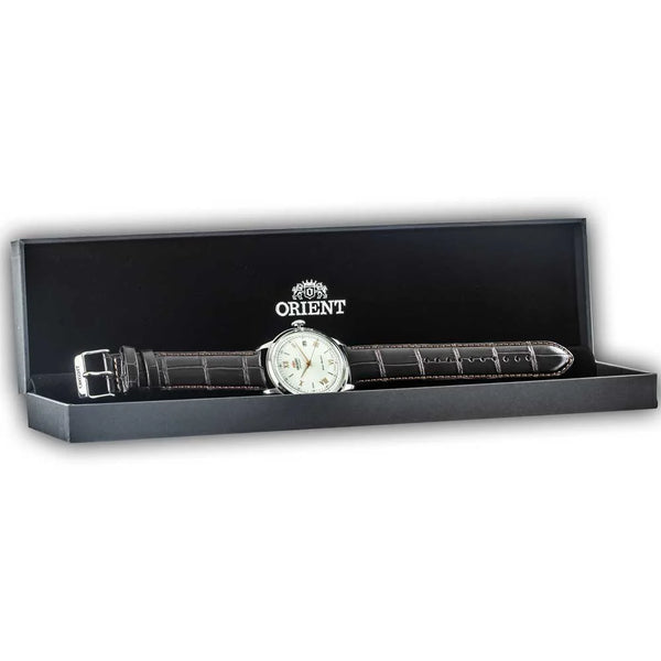 Im Reich zeitloser Eleganz erscheint die ORIENT AC00 Bambino V2 als ein Leuchtturm klassischer Raffinesse. Präzise gefertigt, verkörpert diese Uhr das Wesen eines verfeinerten Designs und verbindet nahtlos Tradition mit Moderne. Ihr rundes Gehäuse, getaucht in einen dezenten silbergrauen Farbton, umrahmt ein hellgraues Zifferblatt, das zurückhaltenden Luxus flüstert. Das Mineralglas schützt das Zifferblatt und sorgt für Klarheit und Widerstandsfähigkeit, während die Pull-&-Push-Krone eine taktile Verbindung zu ihrem mechanischen Herzen bietet. Eingeschlossen ist das Kaliber F6724, ein Wunderwerk der Technik mit 22 Steinen, das eine tägliche Genauigkeit verspricht, die zwischen +25 und -15 Sekunden schwankt. Diese Uhr ist nicht nur eine Zeitmesser, sie ist eine Symphonie der Bewegung, mit ihren Handaufzugs- und Automatikfunktionen, die eine Verbeugung vor der Uhrmacherkunst darstellen. Das braune Lederband, gesichert mit einer Dornschließe, umschließt das Handgelenk mit Komfort und Stil, seine erdigen Töne ergänzen das klassische Auftreten der Uhr. Wasserresistent, steht sie bereit, Sie durch die unvorhersehbaren Momente des Lebens zu begleiten. Die Datumsanzeige fügt eine praktische Note hinzu und sorgt dafür, dass Sie immer mit der Welt im Einklang sind. Diese ORIENT Classic Uhr ist mehr als ein Accessoire, sie ist ein Statement zeitloser Eleganz, ein Zeugnis der beständigen Anziehungskraft klassischen Designs.