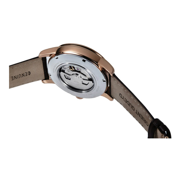 Im Bereich der Uhrmacherkunst, wo Zeitmesser nicht nur Instrumente, sondern Geschichtenerzähler sind, erscheint die ORIENT Classic AK00 Sun & Moon als ein Zeugnis zeitloser Eleganz und mechanischer Meisterschaft. Gefertigt im Herzen der Präzisionsingenieurkunst, verkörpert diese Uhr die perfekte Mischung aus Tradition und Innovation. Ihr rundes Gehäuse, getaucht in den warmen Glanz von Roségold, fesselt das Auge mit einer subtilen, aber eindrucksvollen Präsenz. Mit einem Durchmesser von 42 mm findet sie eine harmonische Balance zwischen Kühnheit und Raffinesse und ist somit ein idealer Begleiter für den anspruchsvollen Gentleman. Das schokoladenbraune Zifferblatt, das an reichhaltigen, samtigen Kakao erinnert, dient als Leinwand für den filigranen Tanz der Zeit, wobei drei Zeiger elegant über seine Oberfläche gleiten. Die Tages- und Datumsanzeige fügt eine praktische Ebene hinzu, nahtlos in das Design integriert. Unter dem Saphirglas schlägt das Herz der Uhr mit der Präzision des Kalibers F6B24, einem mechanischen Wunderwerk mit 22 Steinen. Dieses Werk, sowohl handaufgezogen als auch automatisch, sorgt dafür, dass die Zeit mit einer Genauigkeit von +25/-15 Sekunden pro Tag gehalten wird. Der transparente Boden bietet einen Einblick in die filigranen Mechanismen, eine Erinnerung an die Handwerkskunst, die darin steckt. Um das Handgelenk schlingt sich ein schokoladenbraunes Lederband, die Uhr wird mit einer Faltschließe gesichert, die sowohl Komfort als auch Sicherheit bietet. Mit einer Wasserdichtigkeit von 50 Metern ist sie ebenso vielseitig wie elegant und bereit, ihren Träger von Vorstandssitzungen bis zu Abendgesellschaften zu begleiten. Die ORIENT Classic AK00 Sun & Moon ist nicht nur eine Uhr, sie ist eine Feier der Zeit selbst, ein Stück, das mit jedem Ticken Geschichten von Erbe und Innovation flüstert.