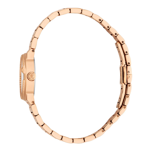 In der Welt der Mode, in der Eleganz auf Innovation trifft, entsteht eine Uhr, die das Wesen von Raffinesse und Stil verkörpert. Gefertigt im Herzen der Schweizer Uhrmacherkunst, ist diese Roberto Cavalli Lady Uhr ein Zeugnis für verfeinertes Design und exquisite Handwerkskunst. Ihr rundes Gehäuse, getaucht in den warmen Glanz von Roségold, fängt das Licht bei jeder Bewegung ein und schafft einen faszinierenden Tanz der Reflexionen. Mit einem Gehäusedurchmesser von 26 mm sitzt sie anmutig am Handgelenk, ein perfekter Begleiter für die moderne Frau, die sowohl Form als auch Funktion schätzt. Das silbergraue Zifferblatt, eine Leinwand der Subtilität, ist mit drei Zeigern versehen, die von einem präzisen Quarzwerk angetrieben werden und sicherstellen, dass die Zeit immer auf Ihrer Seite ist. Das Mineralglas bietet eine klare Sicht auf das Zifferblatt, während die Pull & Push-Krone einfache Einstellungen ermöglicht. Das Handgelenk umschließt ein Edelstahlarmband, ebenfalls in Roségold, das das Gehäuse ergänzt und dem Design einen Hauch von Kontinuität verleiht. Die Butterfly-Faltschließe mit Druckknopf sorgt für einen sicheren und bequemen Sitz und macht sie zu einer nahtlosen Ergänzung jedes Outfits. Mit einer Wasserdichtigkeit von bis zu 50 Metern ist diese Uhr so vielseitig wie schön und bereit, Sie vom Konferenzraum bis zum Abendessen zu begleiten. Die Roberto Cavalli Lady Uhr ist nicht nur eine Uhr, sie ist ein Statement der Eleganz, ein Spiegelbild des tadellosen Geschmacks der Trägerin und eine Feier zeitloser Mode.