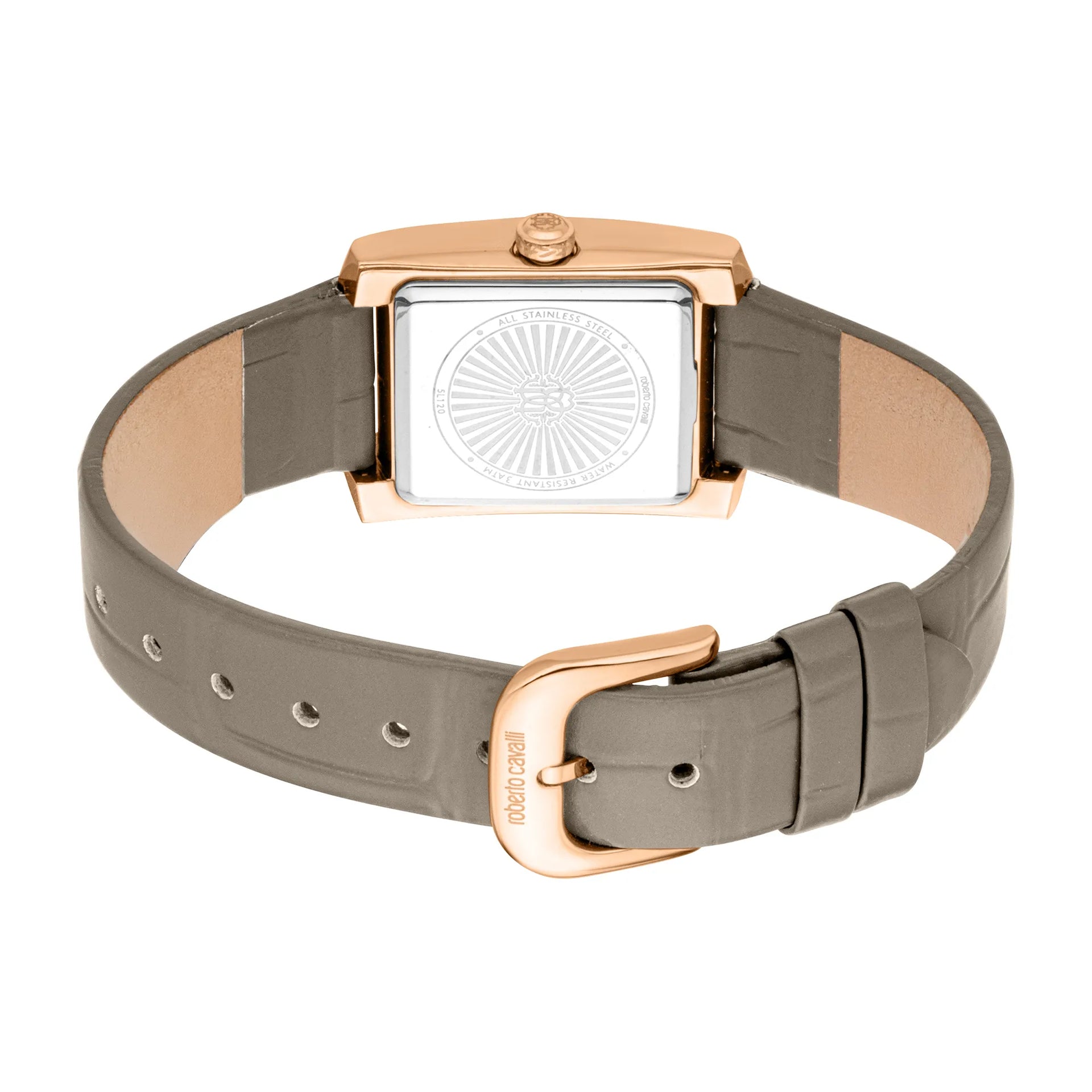 In der Welt der Mode, in der Eleganz auf Innovation trifft, entsteht eine Uhr, die das Wesen von Raffinesse und Stil einfängt. Gefertigt im Herzen der Schweizer Uhrmacherkunst, ist diese Roberto Cavalli Lady Uhr ein Zeugnis für verfeinertes Design und exquisite Handwerkskunst. Das rechteckige Gehäuse, getaucht in einen luxuriösen Roségoldton, strahlt eine zeitlose Anziehungskraft aus und ergänzt perfekt das zarte Handgelenk der modernen Frau. Das Mineralglas bietet einen klaren Blick auf das silbergraue Zifferblatt, auf dem drei Zeiger anmutig tanzen, angetrieben von der Präzision eines Quarzwerks mit GL34 Kaliber. Das hellgraue Lederarmband, gesichert mit einer Dornschließe, schmiegt sich bequem um das Handgelenk und verleiht jedem Outfit einen Hauch von zurückhaltender Eleganz. Wasserresistent ist diese Uhr ebenso praktisch wie schön und bereit, Sie auf den Abenteuern des Lebens zu begleiten. Die Pull & Push Krone sorgt für einfache Zeiteinstellungen und macht sie zu einem zuverlässigen Begleiter für die modebewusste Frau. Mit seiner harmonischen Mischung aus Farben und Materialien ist diese Roberto Cavalli Lady Uhr nicht nur ein Accessoire, sondern ein Statement von Stil und Anmut, das überall einen bleibenden Eindruck hinterlässt.