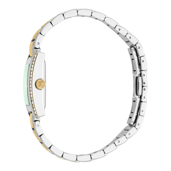 In der Welt der Mode, in der Eleganz auf Innovation trifft, entsteht eine Uhr, die das Wesen von Raffinesse und Stil verkörpert. Gefertigt im Herzen der Schweizer Uhrmacherkunst, ist diese Roberto Cavalli Lady Uhr ein Zeugnis für verfeinertes Design und exquisite Handwerkskunst. Ihr rechteckiges Gehäuse, getaucht in einen eleganten silbergrauen Farbton, strahlt eine moderne Anziehungskraft aus, die sowohl zeitlos als auch zeitgenössisch ist. Das Mineralglas schützt ein Zifferblatt in tiefem Flaschengrün, eine Farbe, die von Geheimnis und Tiefe flüstert und die modebewusste Ästhetik der Uhr perfekt ergänzt. Das Edelstahlarmband, vergoldet in luxuriösem Gelbgold, umschließt das Handgelenk mit einem Gefühl von Opulenz, gesichert durch eine Butterfly-Faltschließe mit Druckknopf für Leichtigkeit und Eleganz. Im Inneren sorgt die Präzision eines Quarzwerks, angetrieben vom Kaliber GL34, dafür, dass die Zeit mit unerschütterlicher Genauigkeit gehalten wird. Die Drei-Zeiger-Anzeige gleitet anmutig über das Zifferblatt, ein Tanz der Zeit, der sowohl faszinierend als auch präzise ist. Wasserresistent ist diese Uhr ebenso praktisch wie schön und bereit, ihre Trägerin durch die Abenteuer des Lebens zu begleiten. Entworfen für die moderne Frau, die die feinen Dinge schätzt, ist diese Roberto Cavalli Lady Uhr mehr als nur eine Uhr, sie ist ein Stil-Statement, ein Spiegelbild des Charakters und eine Feier der Kunst der Uhrmacherei.