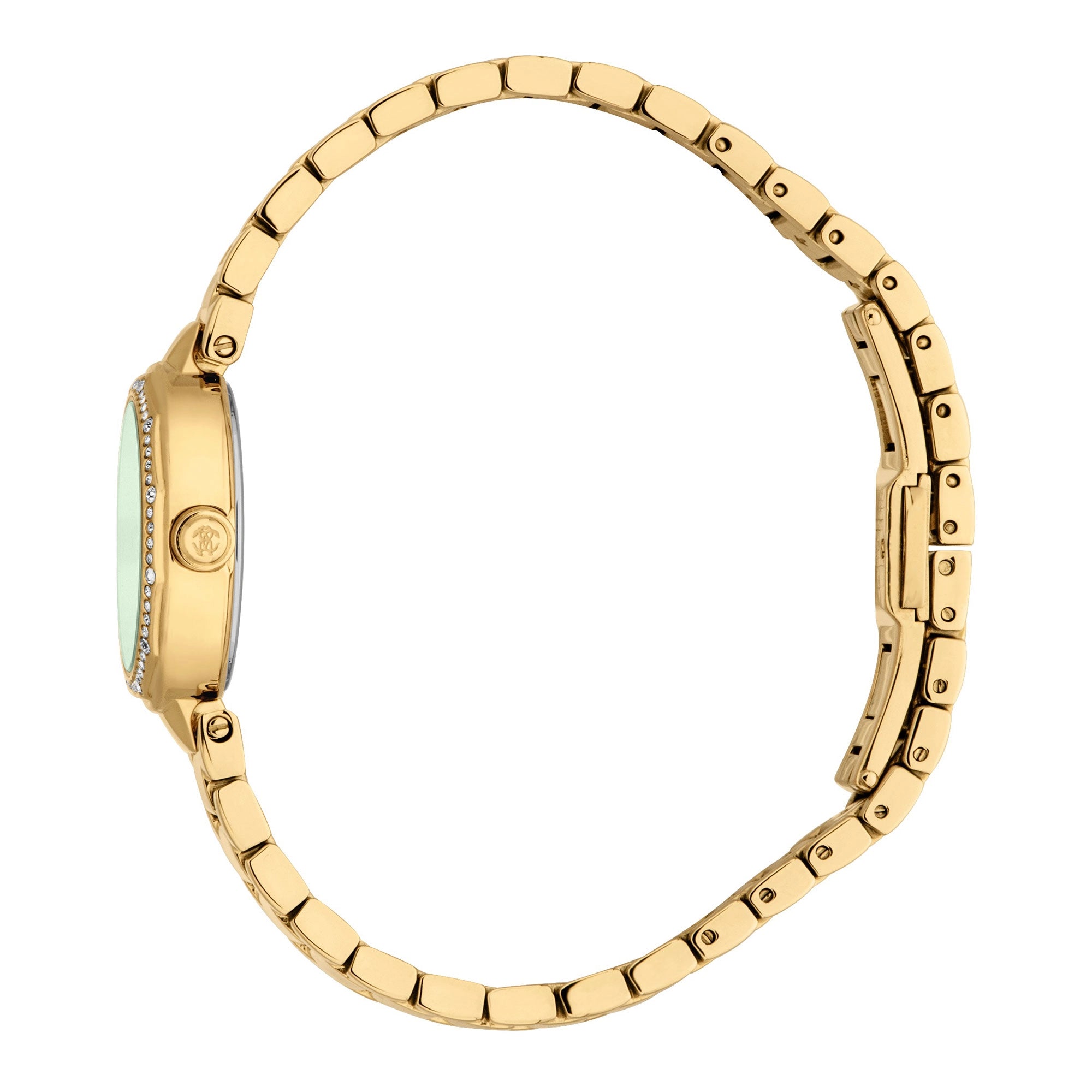 Discover the exquisite Roberto Cavalli Lady RC5L144M0065, a symbol of sophisticated fashion for the modern woman. This captivating timepiece boasts a 26mm round stainless steel case, exquisitely IP plated in radiant yellow gold, and adorned with 61 dazzling zircons for an unparalleled sparkle. The vibrant bottle green dial offers a stunning contrast, making this watch a true statement piece.