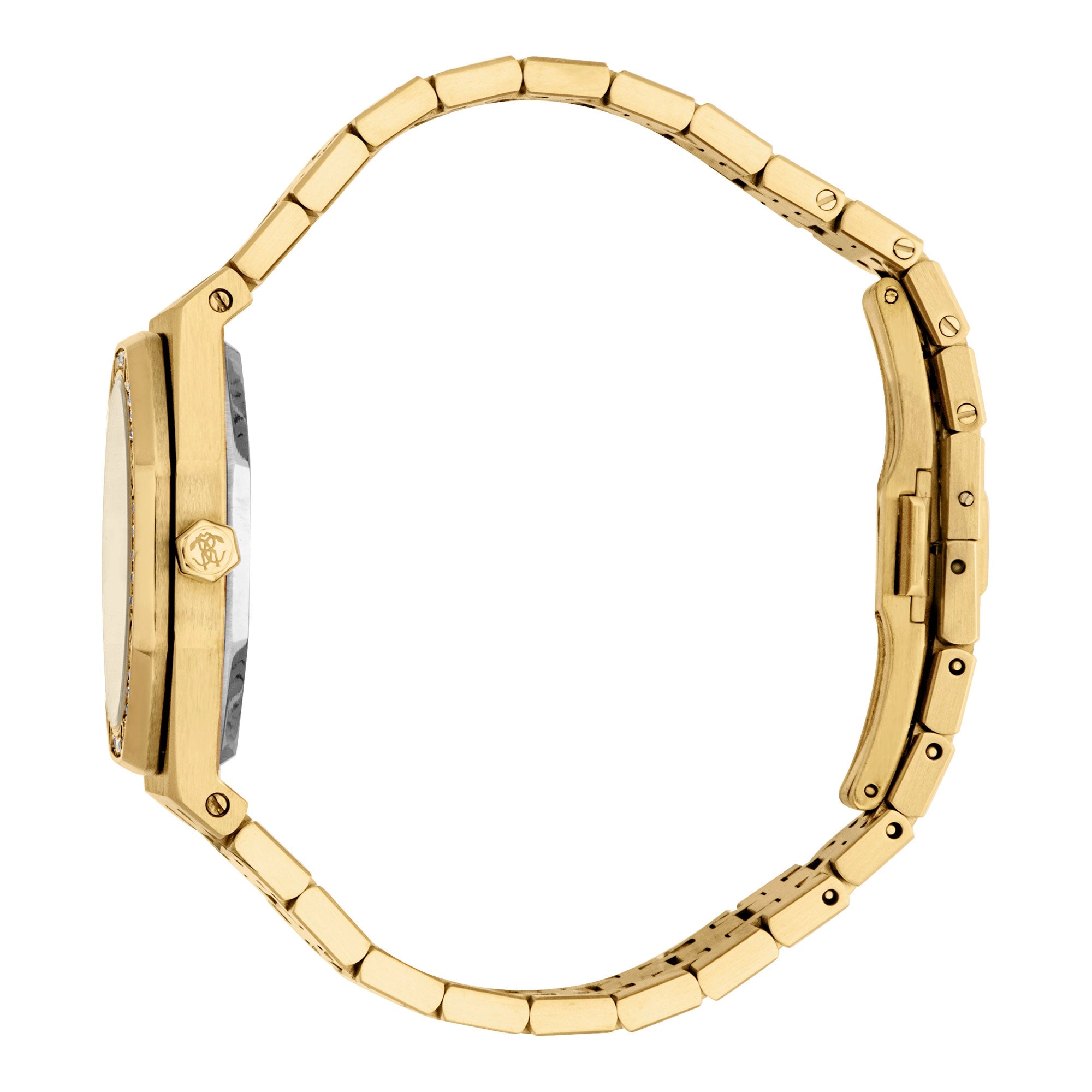 Complementing the case, the watch features a matching yellow gold IP plated stainless steel band (18cm length, 21mm width), ensuring comfort and security with its folding deployant clasp with push-button. Whether for a special occasion or to elevate your daily style, this Roberto Cavalli women's watch is the ultimate accessory. Its fashion-forward design makes it a must-have luxury timepiece for adult females.