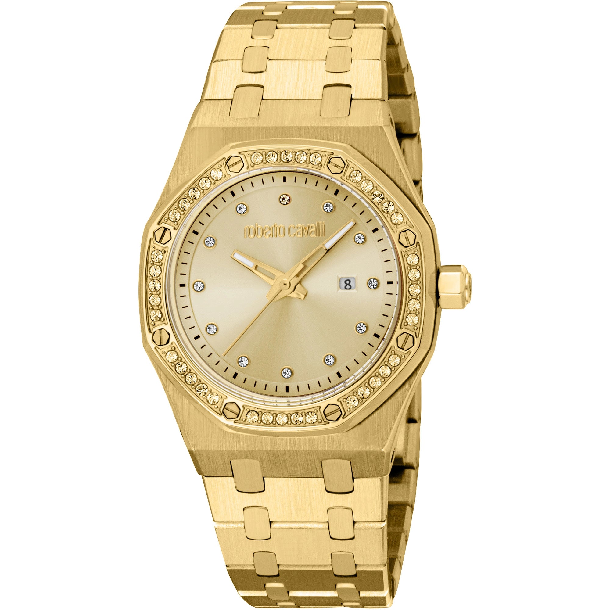 Discover the exquisite Roberto Cavalli Lady Watch (RC5L159M0055), a true statement of fashion and elegance for the modern woman. This stunning timepiece, from the SS2026 collection, boasts a luxurious yellow gold IP plated stainless steel case. The perfectly round 34mm case, with a slim 9mm thickness, sparkles with 40 dazzling zircons, creating an irresistible allure.