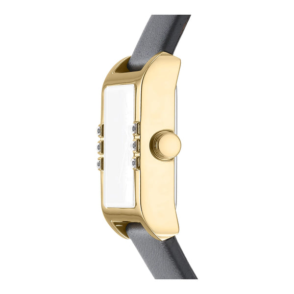 Au cœur de l'élégance urbaine, où la mode rencontre la fonction, émerge une montre qui incarne l'esprit de la sophistication moderne. La DKNY DK1L008 Westside Glitz est un témoignage de l'art de l'horlogerie, conçue avec précision et style pour la femme contemporaine. Son boîtier rectangulaire, baigné d'une teinte luxueuse or jaune, capture l'essence du glamour intemporel, tandis que le diamètre élégant de 22 mm assure une présence délicate mais frappante au poignet. Le cadran gris argenté, une toile d'élégance discrète, est orné de trois aiguilles qui glissent sans effort, animées par un mouvement à quartz fiable. Cette montre n'est pas seulement un accessoire, c'est une déclaration de goût raffiné et de chic urbain. Le verre minéral offre une vue claire du cadran, protégé par une couronne à tirer et pousser qui ajoute une touche de praticité à son design. Le bracelet en cuir gris souris, sécurisé par une boucle ardillon, s'enroule confortablement autour du poignet, offrant un contraste subtil avec le boîtier doré. Résistante à l'eau, cette montre est prête à vous accompagner dans l'agitation de la vie citadine, sans compromettre le style. La DKNY Westside Glitz est plus qu'une montre, c'est une célébration de la pensée avant-gardiste en matière de mode, une pièce qui résonne avec ceux qui apprécient les choses les plus fines de la vie.