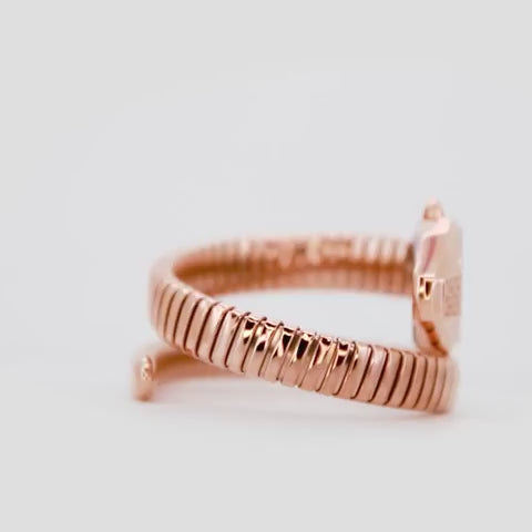 Crafted with a sleek 22mm round stainless steel case and band, both beautifully IP plated in radiant rose gold, this watch exudes contemporary elegance. The captivating antique white Mother of Pearl dial is adorned with four sparkling zircons, adding a touch of glamour. Its unique snake-inspired aesthetic, reminiscent of the timeless 'serpente' motif and keywords like 'Bulgari' or 'Bvlgari' elegance, makes it a standout accessory for any fashion enthusiast.