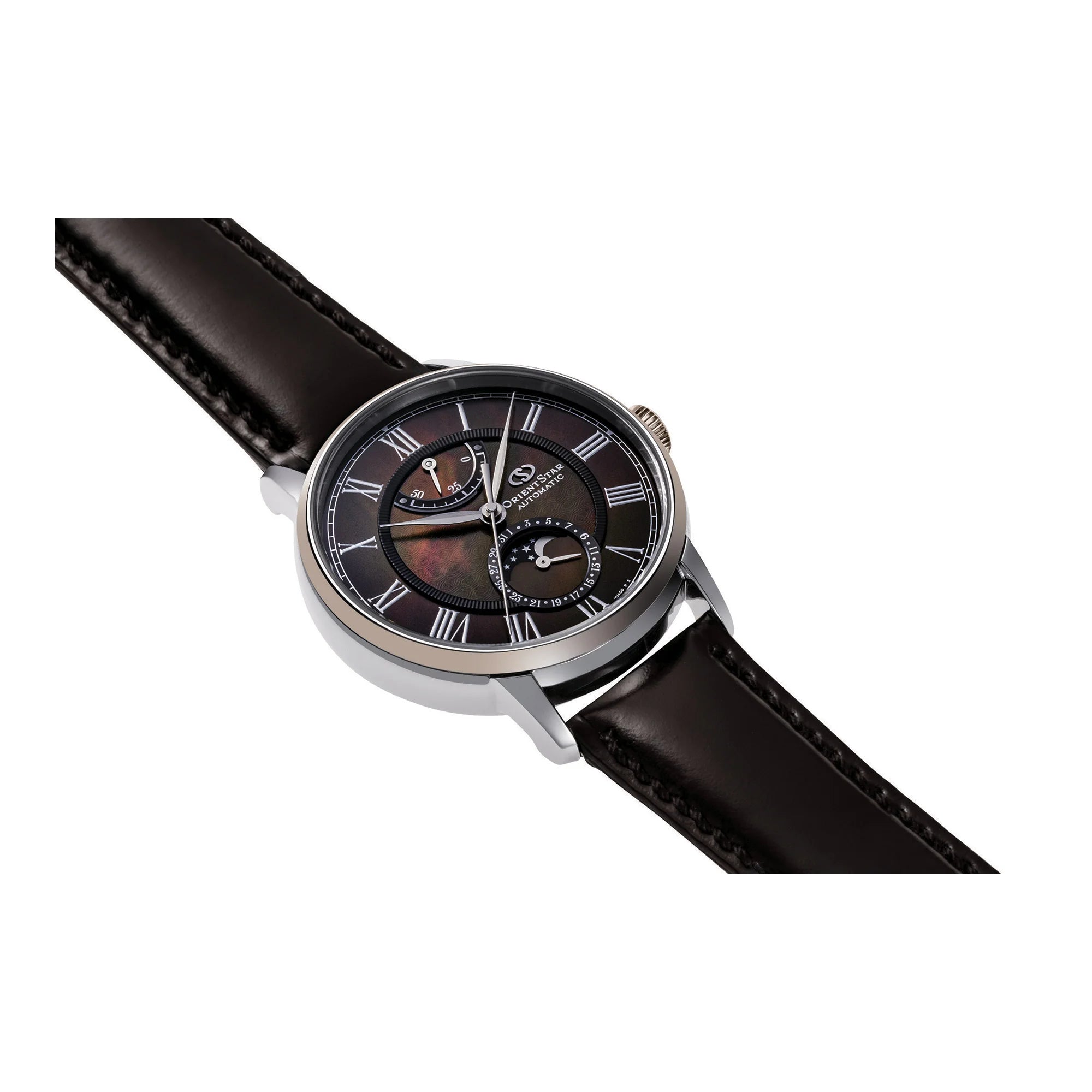 At its heart beats the in-house ORIENT F7M62 automatic and hand-wound movement, manufactured by SEIKO EPSON CORPORATION. This robust caliber features 22 jewels, a convenient hacking function, a prominent power reserve indicator, and a precise daily accuracy of +25/-15 seconds. Admire the intricate mechanics through the screw-down transparent case back, a true testament to Japanese engineering. The captivating moon phase complication and date display add a touch of celestial beauty and practicality to the rich chocolate brown dial.