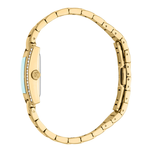 Dans le monde de la haute couture, où l'élégance rencontre l'audace, émerge une montre qui capture l'essence de la sophistication et du style. Fabriquée au cœur de l'horlogerie suisse, cette montre Roberto Cavalli Lady est un témoignage de design raffiné et d'un artisanat exquis. Le boîtier rectangulaire, baigné d'une teinte luxueuse d'or jaune, dégage une aura d'opulence, parfaitement complétée par le bracelet en acier inoxydable assorti. La boucle déployante papillon avec bouton-poussoir assure un ajustement parfait, ajoutant une touche de commodité moderne à cette pièce classique. Le cadran, d'un turquoise vibrant, introduit une touche de couleur qui reflète l'esprit audacieux et aventureux de sa porteuse, en faisant un accessoire remarquable pour toute tenue avant-gardiste. Sous son verre minéral, la montre abrite un mouvement à quartz précis, animé par le calibre GL34, garantissant une mesure du temps exacte. La couronne à tirer et pousser offre une facilité de réglage, tandis que la fonction étanche apporte une praticité sans compromettre le style. Cette montre Roberto Cavalli est plus qu'un simple garde-temps, c'est une déclaration d'élégance et d'individualité, conçue pour la femme qui ose se démarquer dans la foule.
