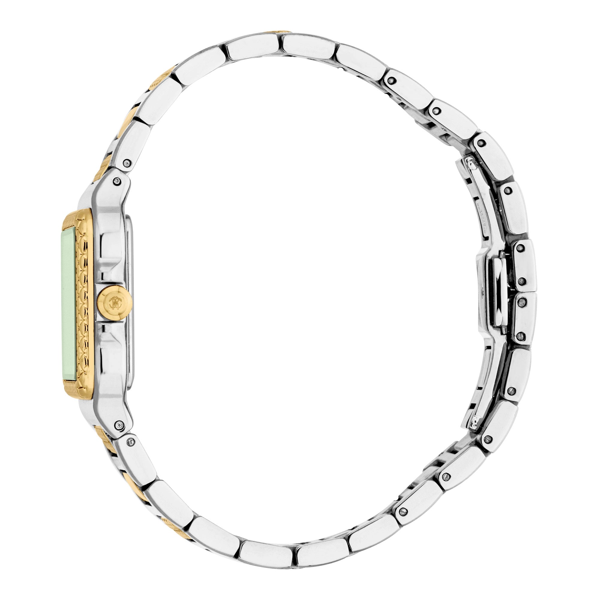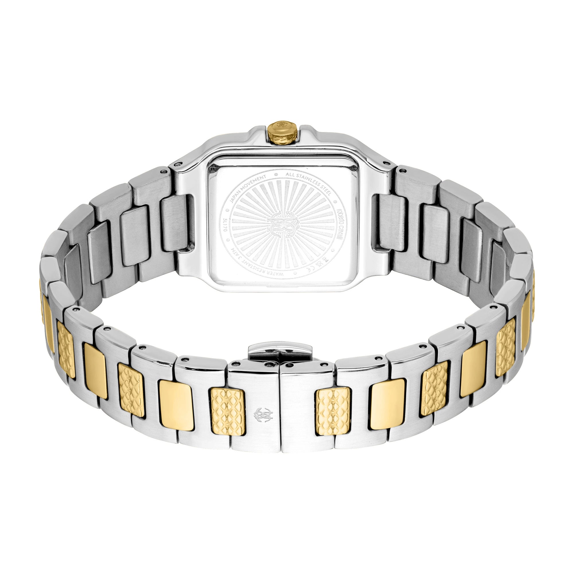 The comfort and durability extend to the matching silver grey and yellow gold IP plated stainless steel band, secured with a secure folding deployant clasp with a push-button for easy wear. With its water-resistant construction and a sleek 8mm case thickness, this Roberto Cavalli luxury watch is built for everyday elegance and enduring style.