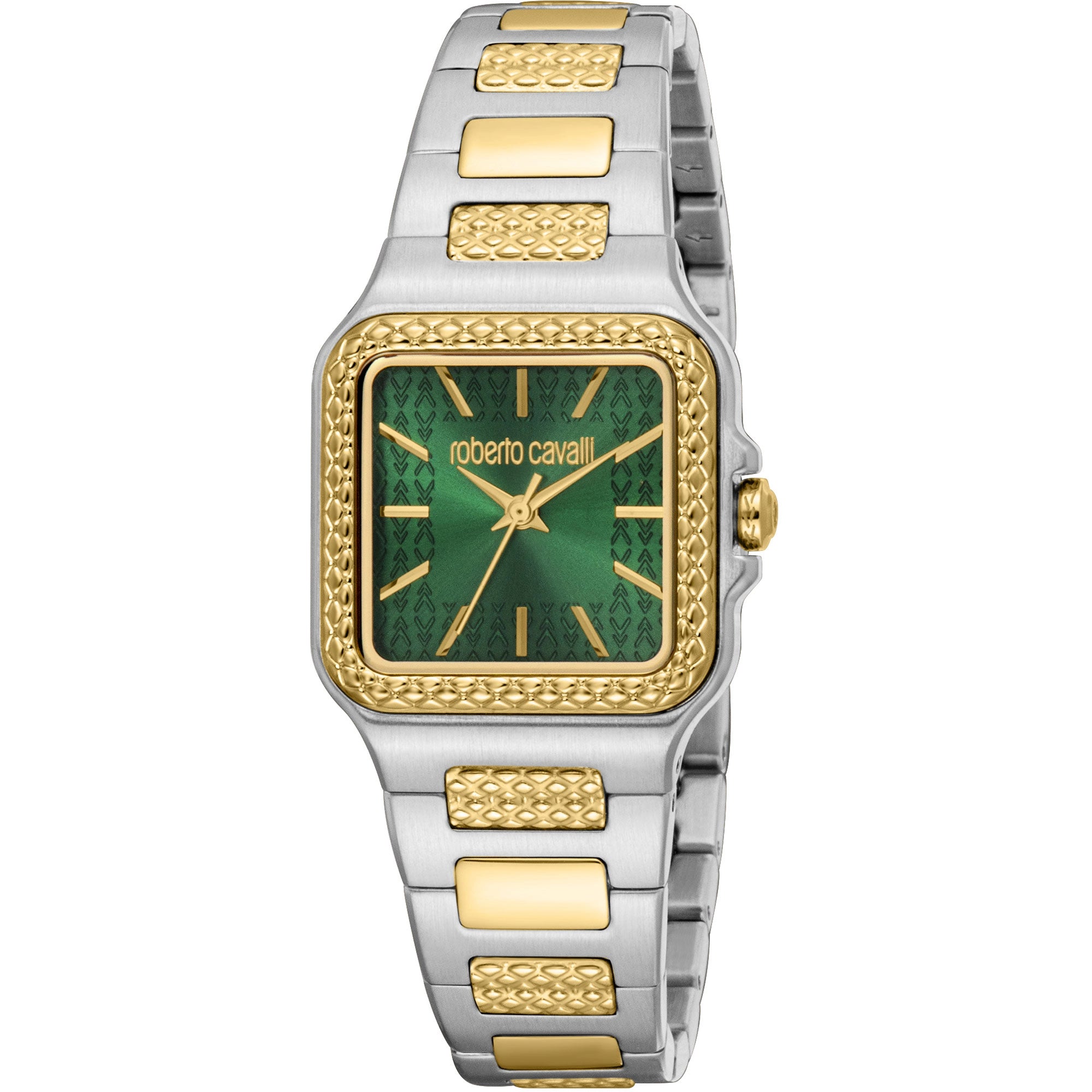 Adoptez une élégance audacieuse avec cette montre Roberto Cavalli, conçue pour la femme moderne qui définit son propre style. Son boîtier carré distinctif, façonné dans un chic bicolore, encadre un cadran vert bouteille captivant, un clin d'œil subtil au luxe sauvage. Plus qu'une simple montre, c'est une extension de votre identité unique, un murmure de sophistication ardente à votre poignet. Imaginez-la captant la lumière, ajoutant un charme irrésistible à chacun de vos mouvements, d'un brunch d'affaires à un rendez-vous au clair de lune.
